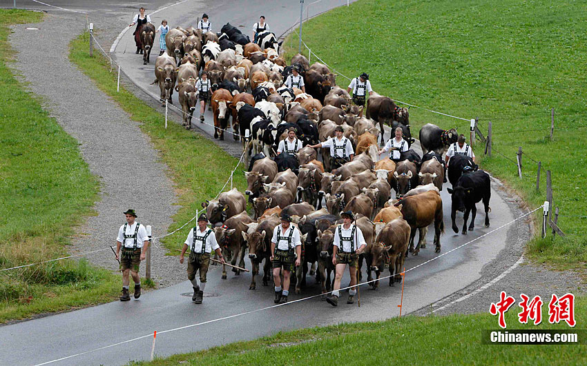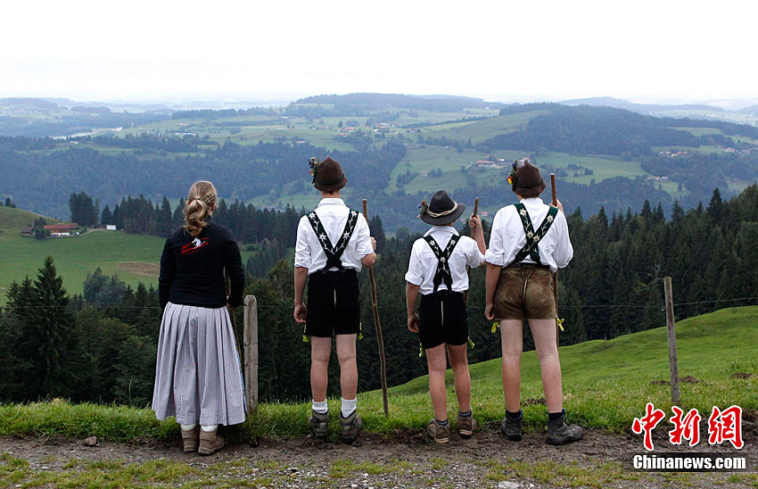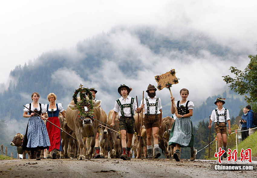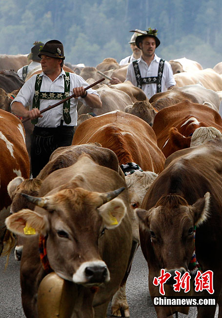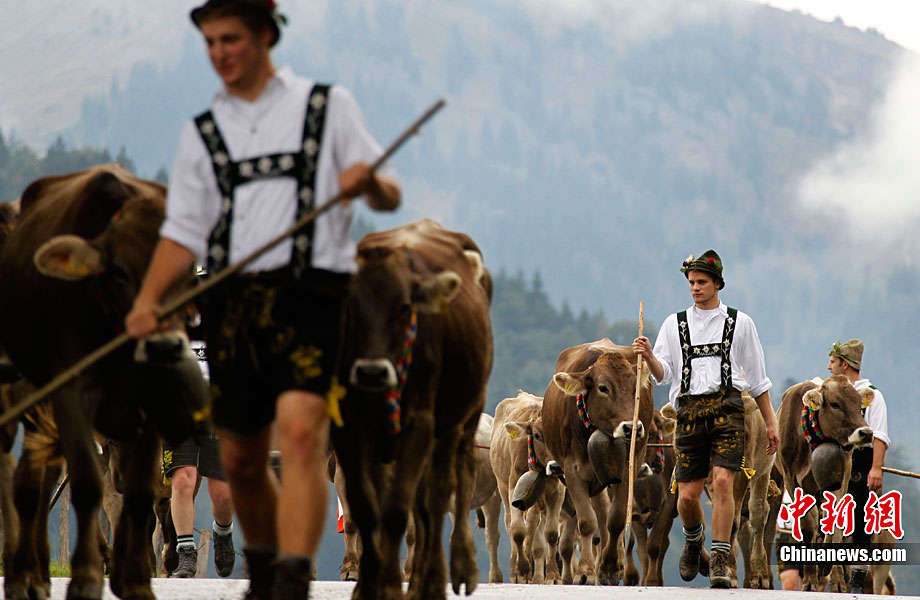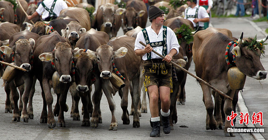 當(dāng)?shù)貢r(shí)間9月10日,德國(guó)奧博斯托芬舉行傳統(tǒng)的趕牛儀式。在山上待了一個(gè)夏天后,超過(guò)1200頭;氐缴焦,當(dāng)?shù)厝藭?huì)把一個(gè)牛頭進(jìn)行裝飾,以此紀(jì)念牛群安全歸來(lái)。
