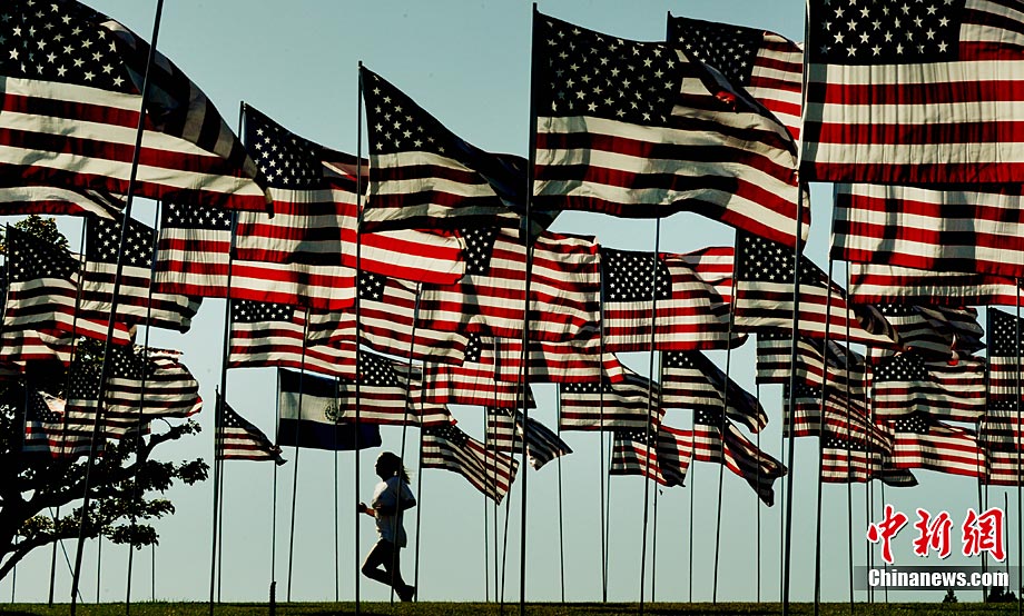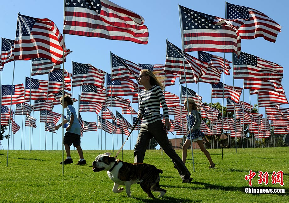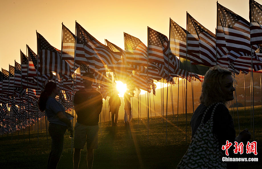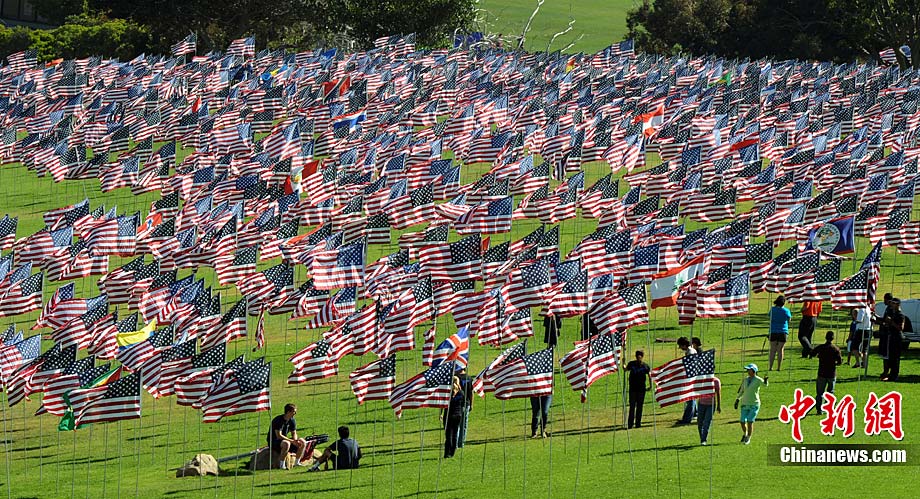 當(dāng)?shù)貢r(shí)間9月10日,在美國(guó)加利福尼亞州的馬里布,一些大學(xué)生在馬里布佩珀代恩大學(xué)的草坪上插上近3000面美國(guó)國(guó)旗和其它國(guó)家和地區(qū)的旗幟,紀(jì)念“9·11”恐怖襲擊事件的遇難者。