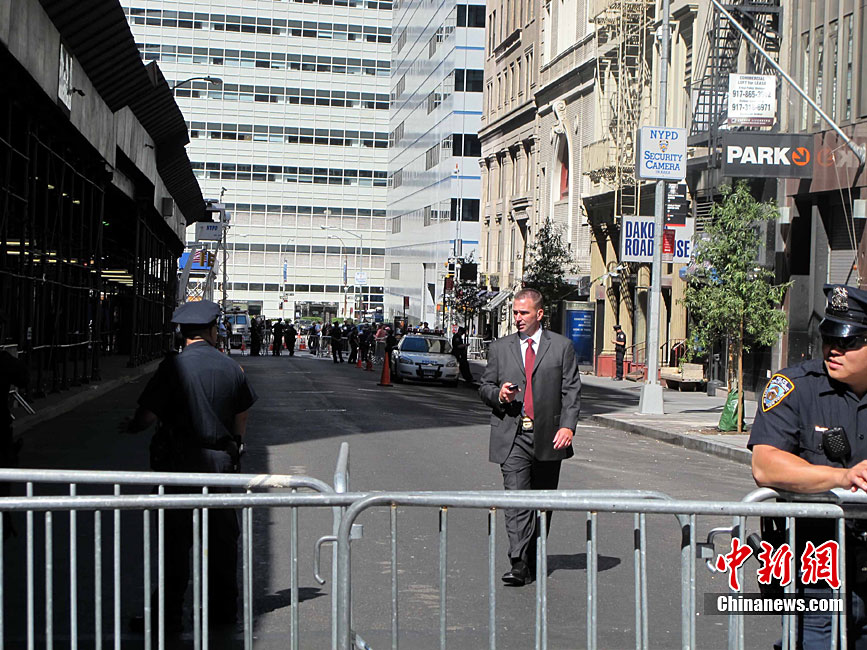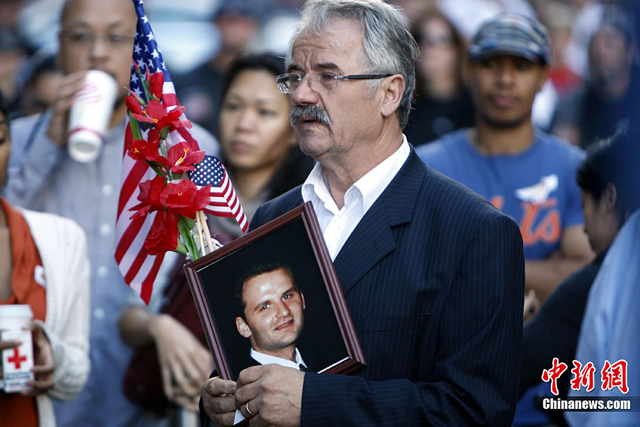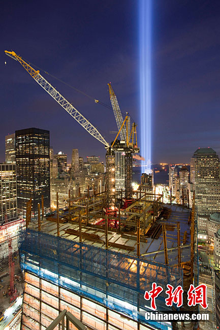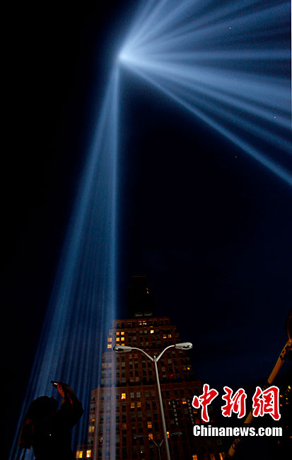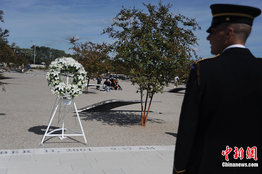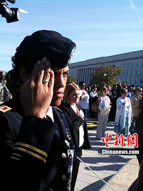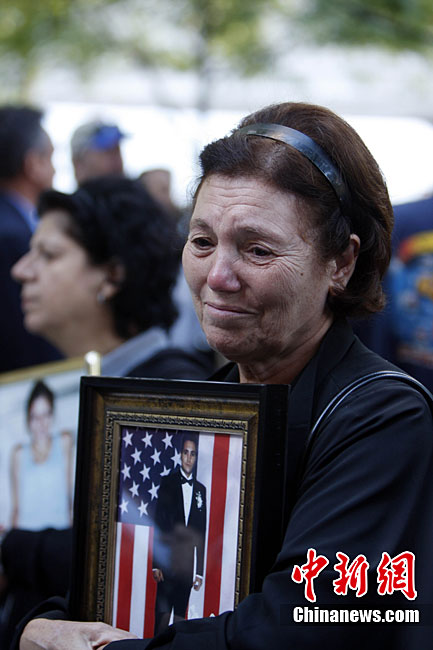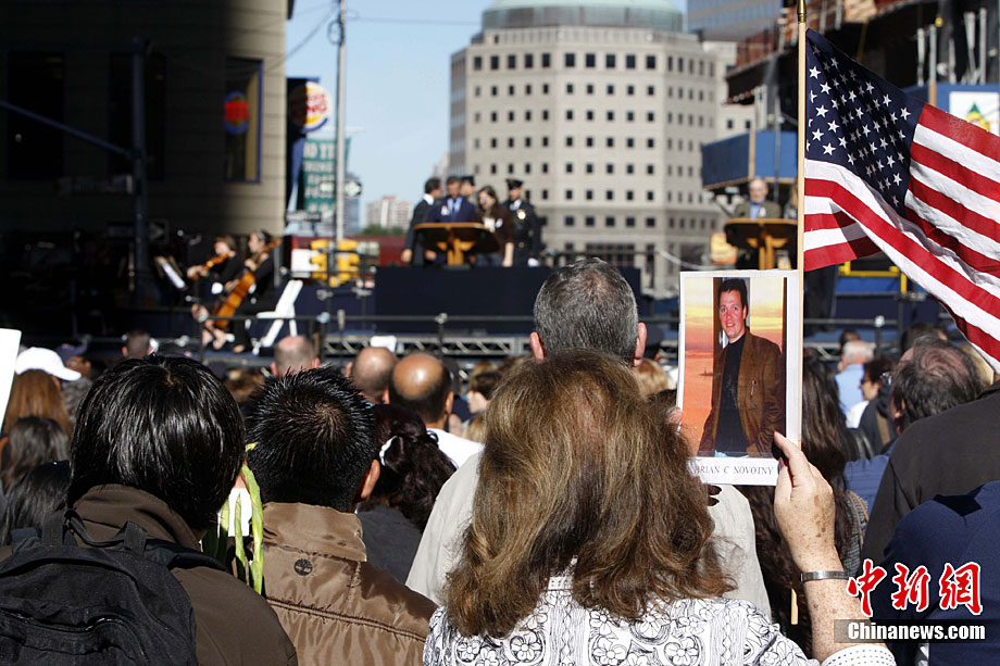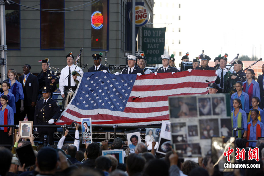紐約世貿(mào)遺址當(dāng)?shù)貢r間9月11日上午舉行“9·11”事件9周年紀(jì)念活動,一面“9·11”事件中殘留下來的美國國旗在活動中展示。中新社記者 孫宇挺 攝