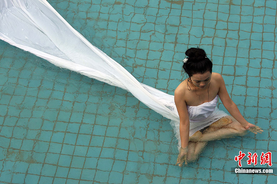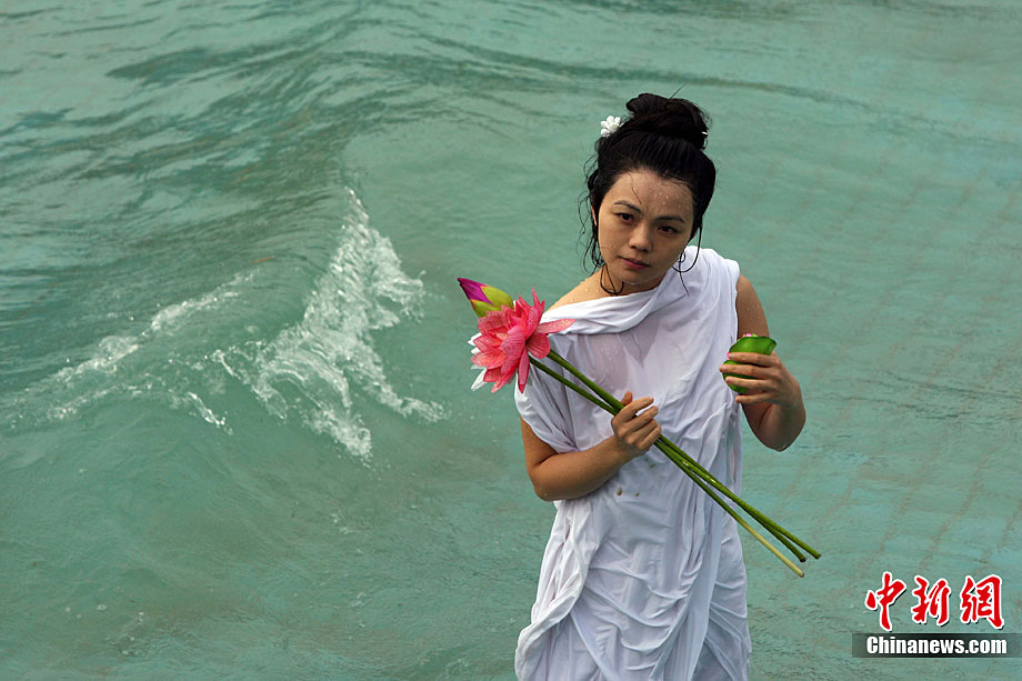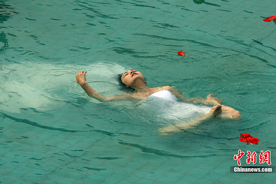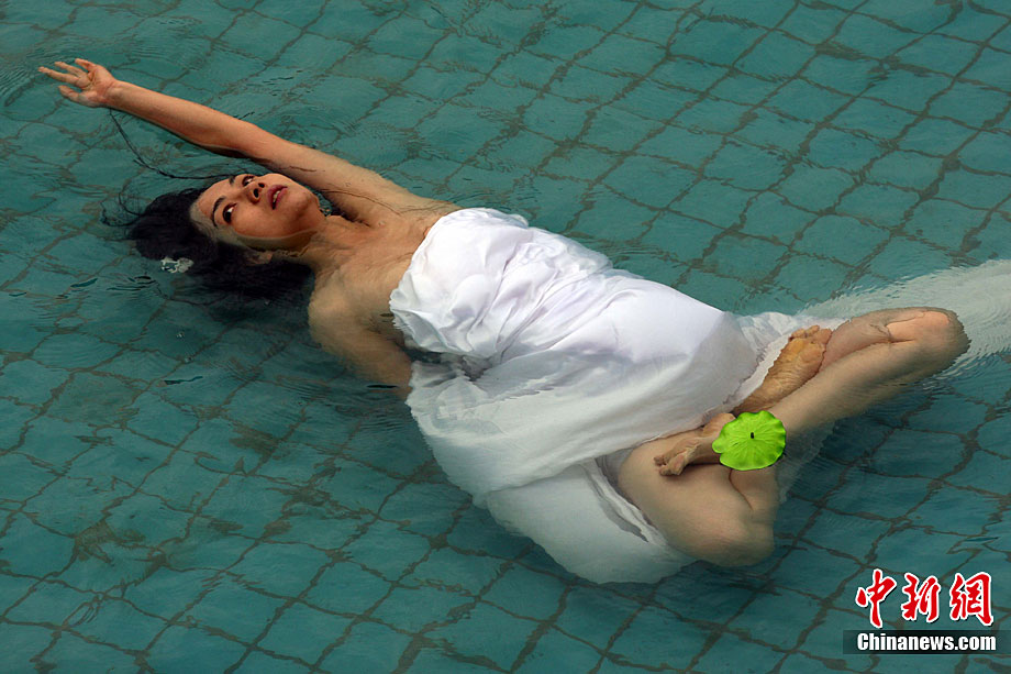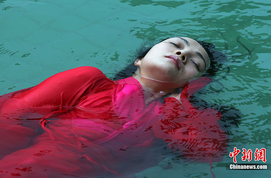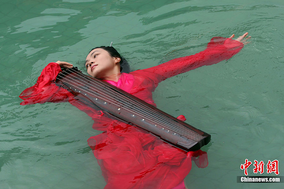 9月11日,漂浮于水上時而禪坐、時而圍繞水中漂浮的古琴緩緩起舞,伴著古琴樂,池水不時變換出各種造型的“水墨畫”,一種前沿新藝術形式在湖北咸寧太乙洞溫泉上演。原創(chuàng)及表演者彭子軒,提出藝術養(yǎng)生的理念,并獨創(chuàng)以子軒內(nèi)練為基礎的藝術漂。ò囆g漂浮舞蹈及藝術漂浮瑜伽),被譽為中國古典花樣游泳。毛建軍 攝