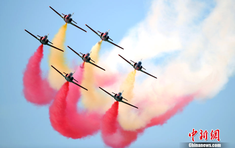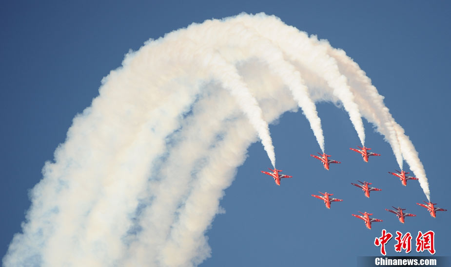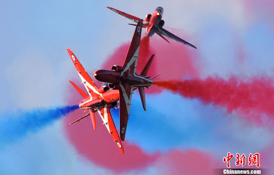 9月12日,為了慶祝意大利“三色箭”特技飛行表演隊(duì)成立50周年,多國(guó)飛行表演隊(duì)“齊聚”意大利,在Rivolto軍事基地進(jìn)行了精彩的空中特技表演。圖為英國(guó)”紅箭“飛行表演隊(duì)進(jìn)行特技表演。