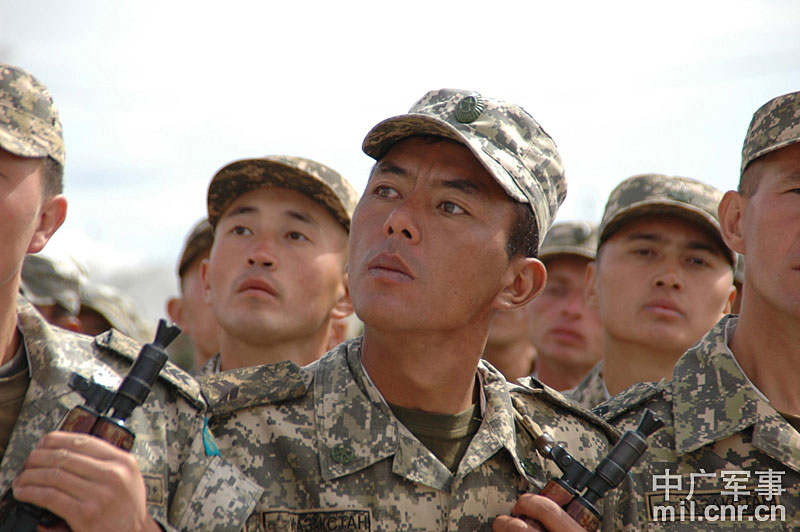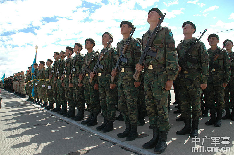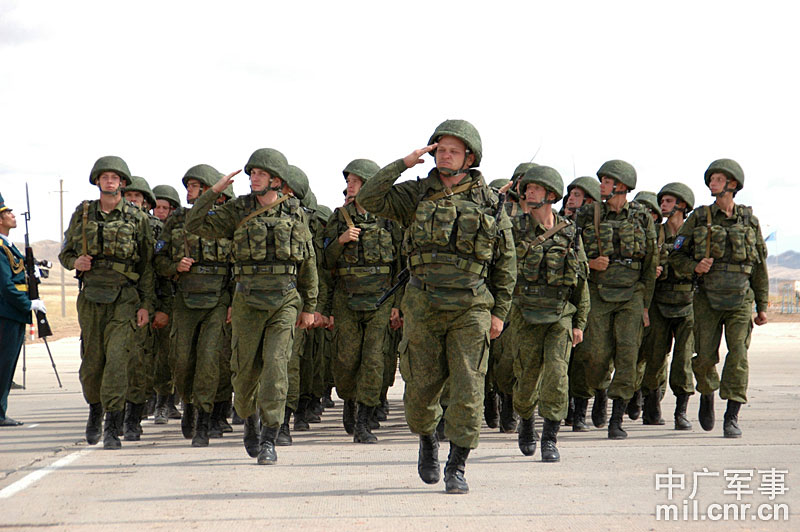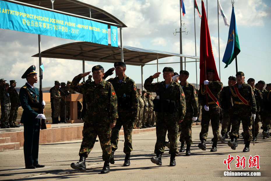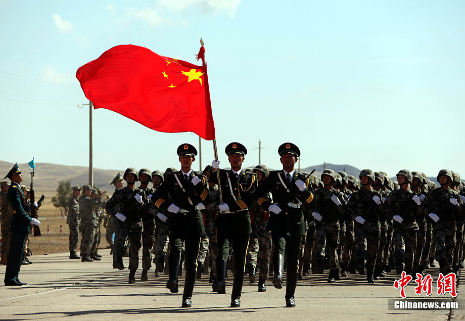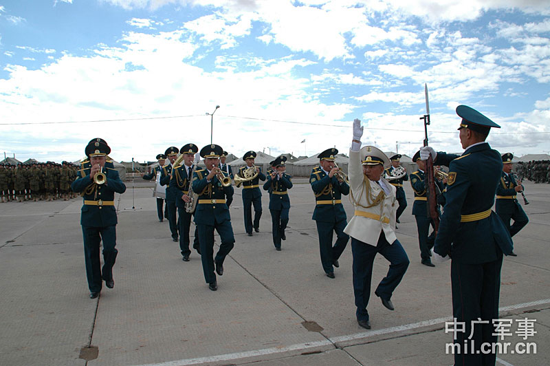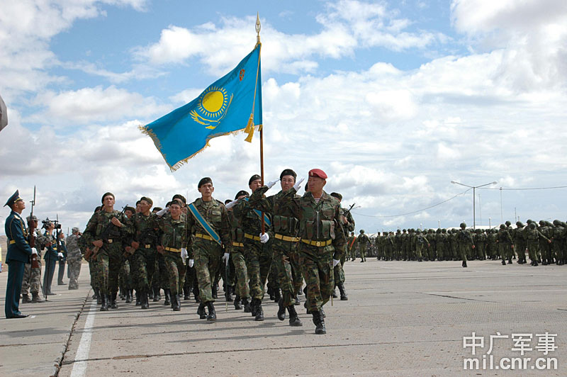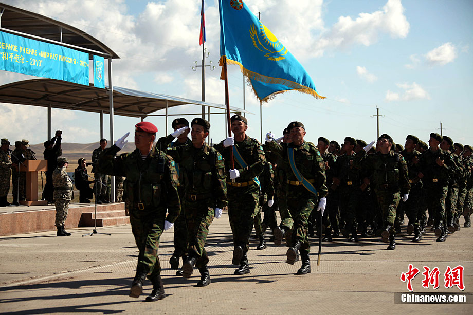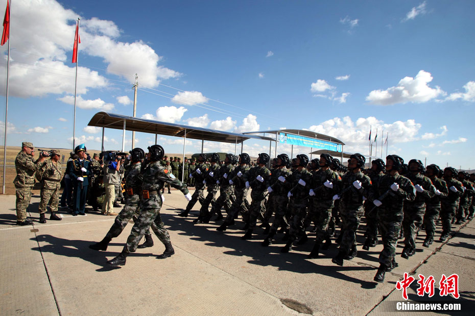 9月13日,“和平使命-2010”上海合作組織聯(lián)合反恐軍事演習(xí)在哈薩克斯坦馬特布拉克訓(xùn)練場舉行盛大的開訓(xùn)儀式,標(biāo)志著這次聯(lián)合軍演由戰(zhàn)役磋商階段正式轉(zhuǎn)入戰(zhàn)役準(zhǔn)備階段。隨后,哈、中、吉、俄、塔五方參演部隊(duì)依次舉行分列式,圖為中方參演部隊(duì)邁著矯健的步伐從開訓(xùn)儀式主席臺前列隊(duì)走過,接受檢閱。中新社記者 孫自法 攝