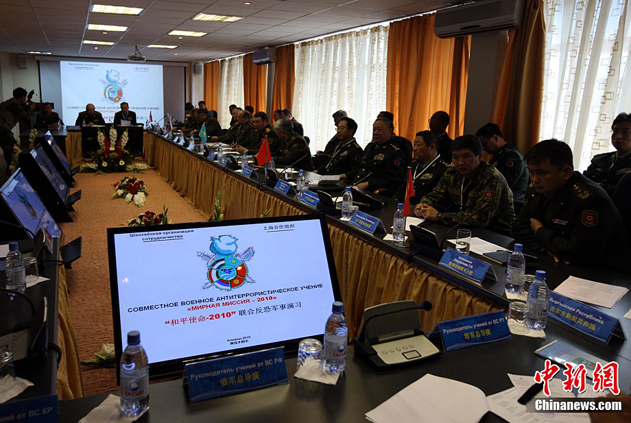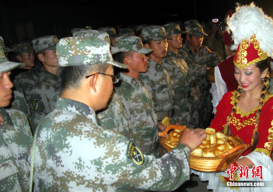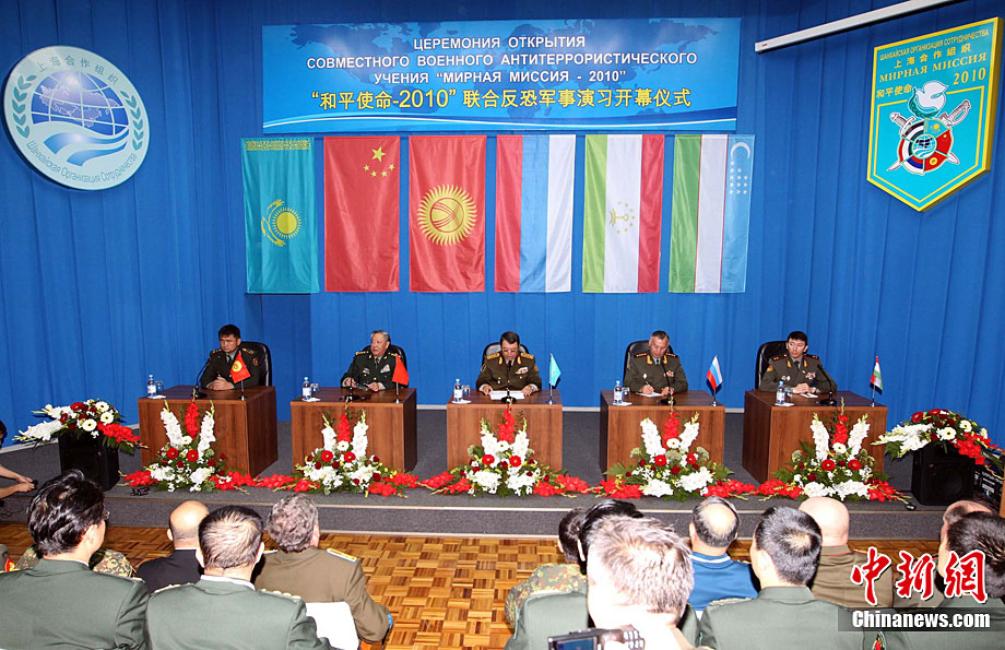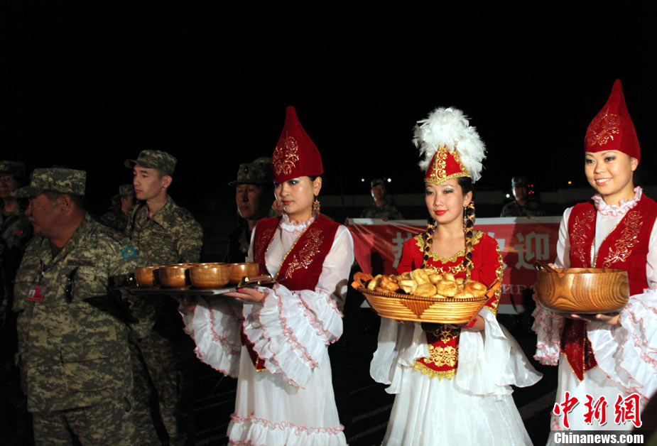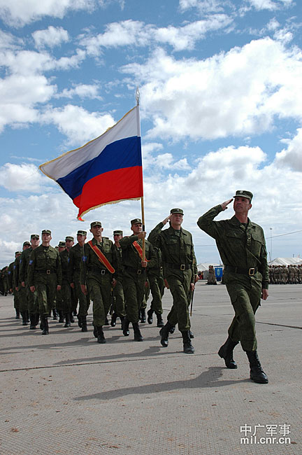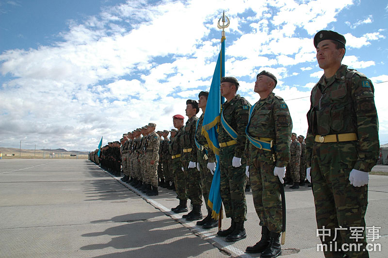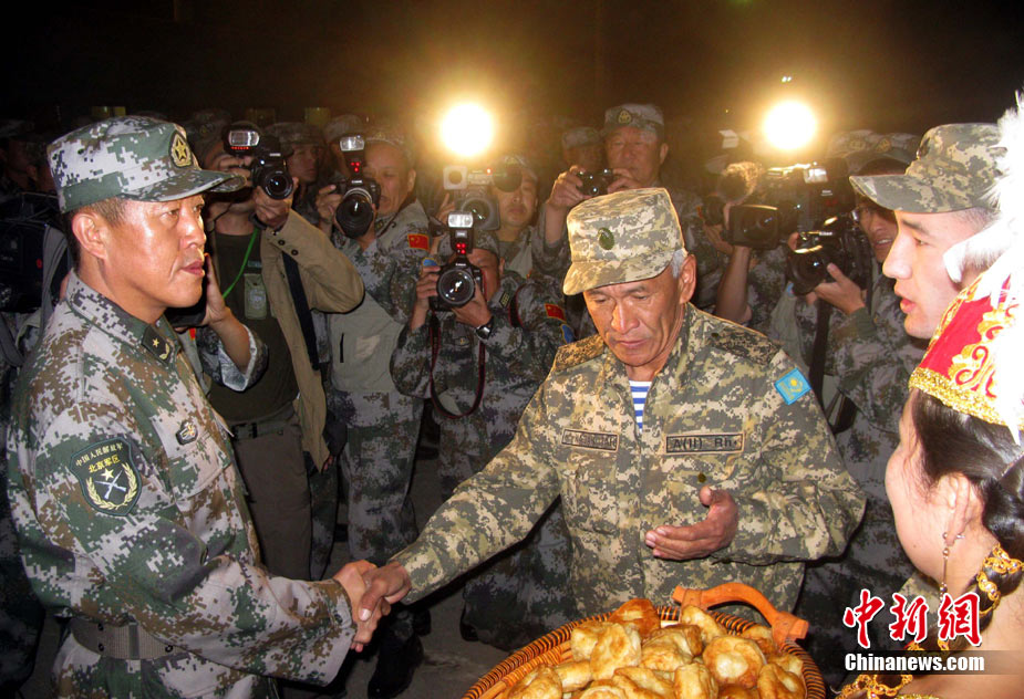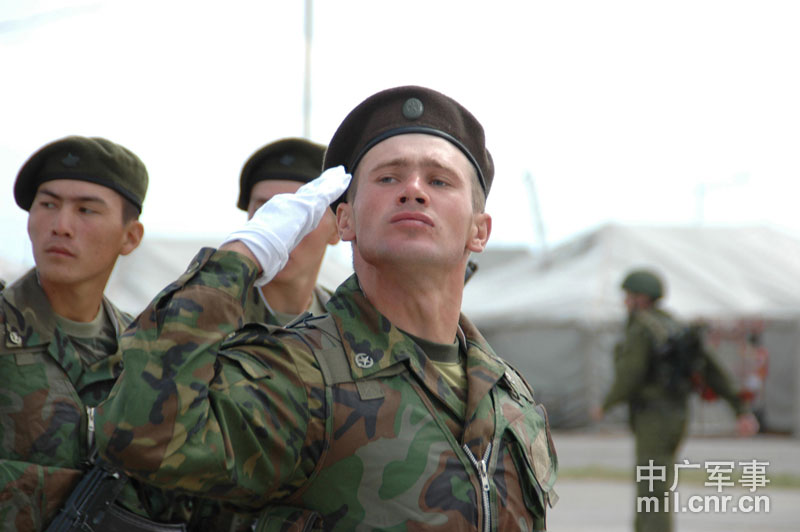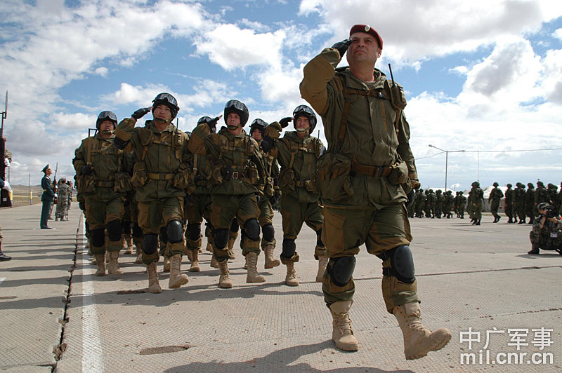 9月13日,“和平使命-2010”上海合作組織聯(lián)合反恐軍事演習(xí)在哈薩克斯坦馬特布拉克訓(xùn)練場舉行盛大的開訓(xùn)儀式,標(biāo)志著這次聯(lián)合軍演由戰(zhàn)役磋商階段正式轉(zhuǎn)入戰(zhàn)役準(zhǔn)備階段。隨后,哈、中、吉、俄、塔五方參演部隊(duì)依次舉行分列式,圖為中方參演部隊(duì)邁著矯健的步伐從開訓(xùn)儀式主席臺前列隊(duì)走過,接受檢閱。中新社記者 孫自法 攝