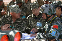 9月13日,“和平使命-2010”上海合作組織聯(lián)合反恐軍事演習(xí)在哈薩克斯坦馬特布拉克訓(xùn)練場舉行盛大的開訓(xùn)儀式,標(biāo)志著這次聯(lián)合軍演由戰(zhàn)役磋商階段正式轉(zhuǎn)入戰(zhàn)役準(zhǔn)備階段。開訓(xùn)儀式后,中方參演部隊總導(dǎo)演、解放軍副總參謀長馬曉天空軍上將在馬特布拉克野戰(zhàn)兵營內(nèi)的中方導(dǎo)演部,向中方戰(zhàn)役指揮部下達(dá)訓(xùn)練課題,宣布初始態(tài)勢。中新社記者 孫自法 攝
