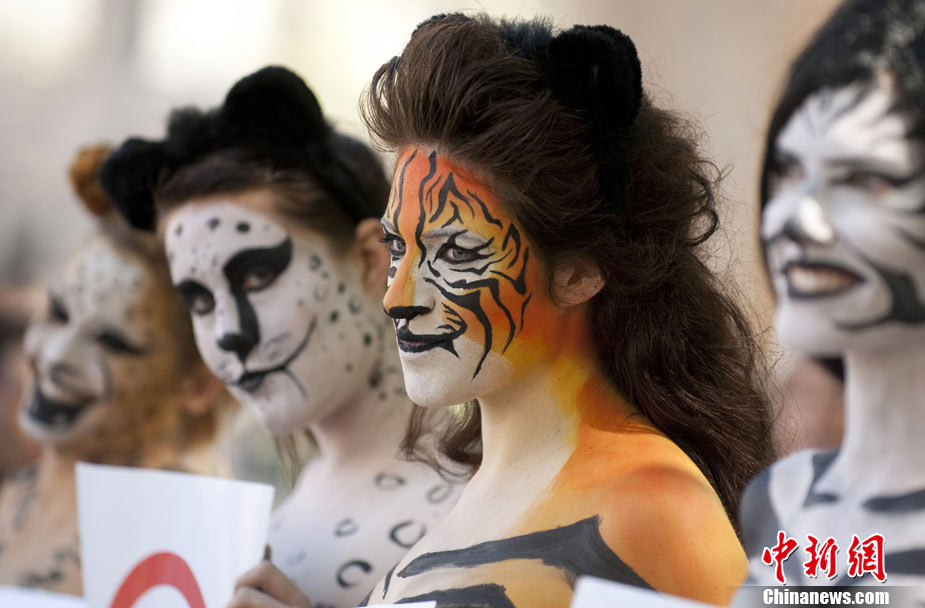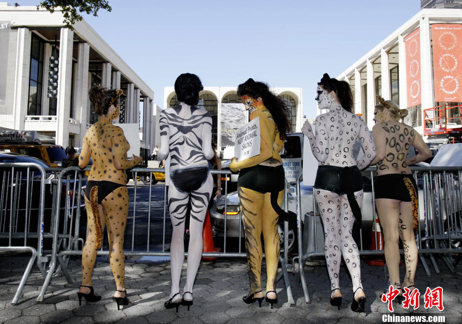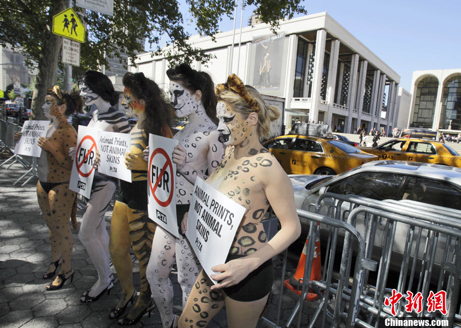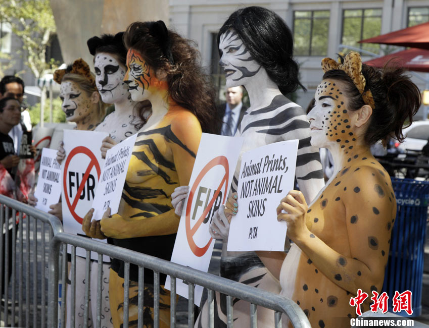 9月14日,在紐約時(shí)裝周進(jìn)行期間,幾位環(huán)保愛好者在身上涂畫“動(dòng)物彩繪”,呼吁保護(hù)動(dòng)物,愛護(hù)環(huán)境。