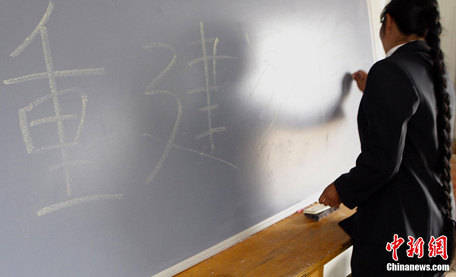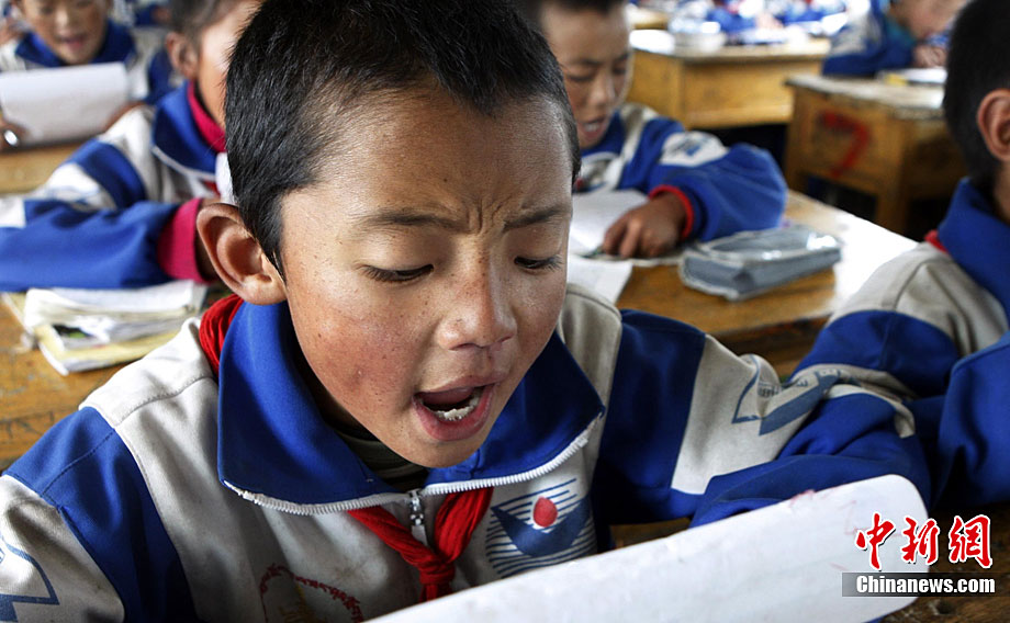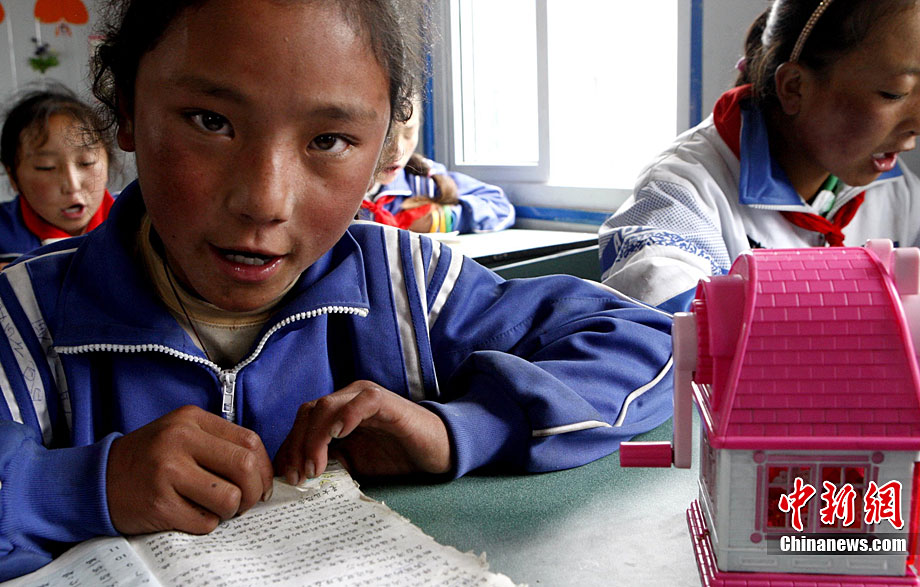 時逢中秋佳節(jié)到來之際,經(jīng)歷了地震5個月后的中國青海玉樹災區(qū)正在加緊重建家園。如今,玉樹街頭臨時搭建的貨店及百貨商店里各種日用品琳瑯滿目,菜市場新鮮的蔬菜和水果供應充足,幾家重新開業(yè)的飯館生意興隆。圖為在當?shù)匦W,學生們在重建的教室里上課。中新社記者 錢興強 攝