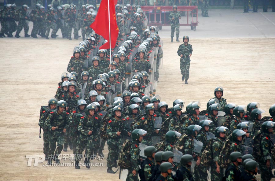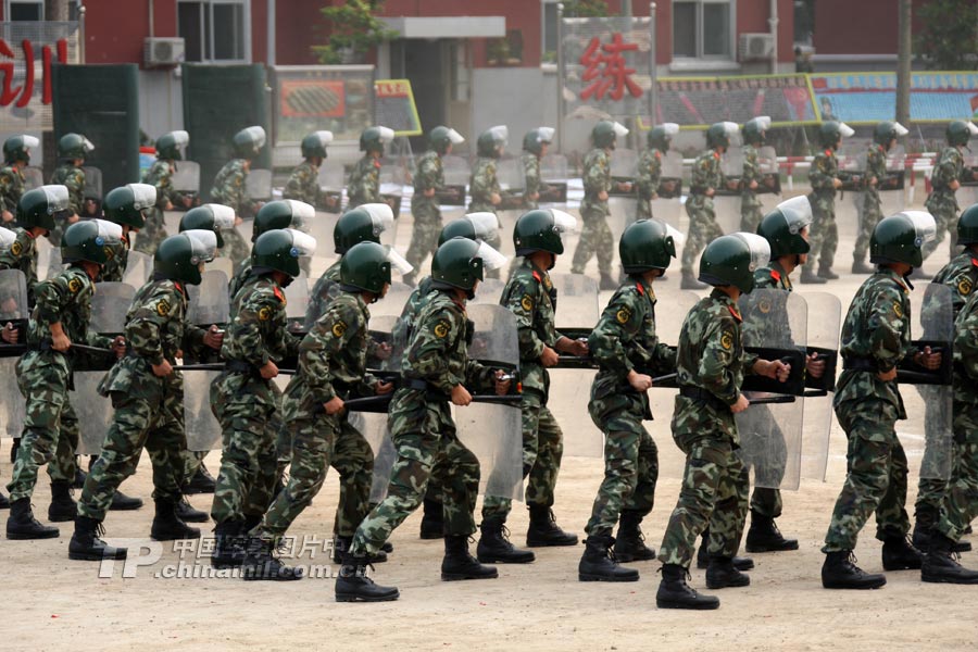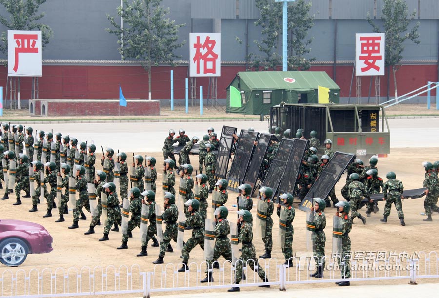 訓(xùn)練場內(nèi),面對(duì)各種突發(fā)情況,官兵手持盾牌、警棍,排成各種陣型,疾進(jìn)如風(fēng),徐推如林……
