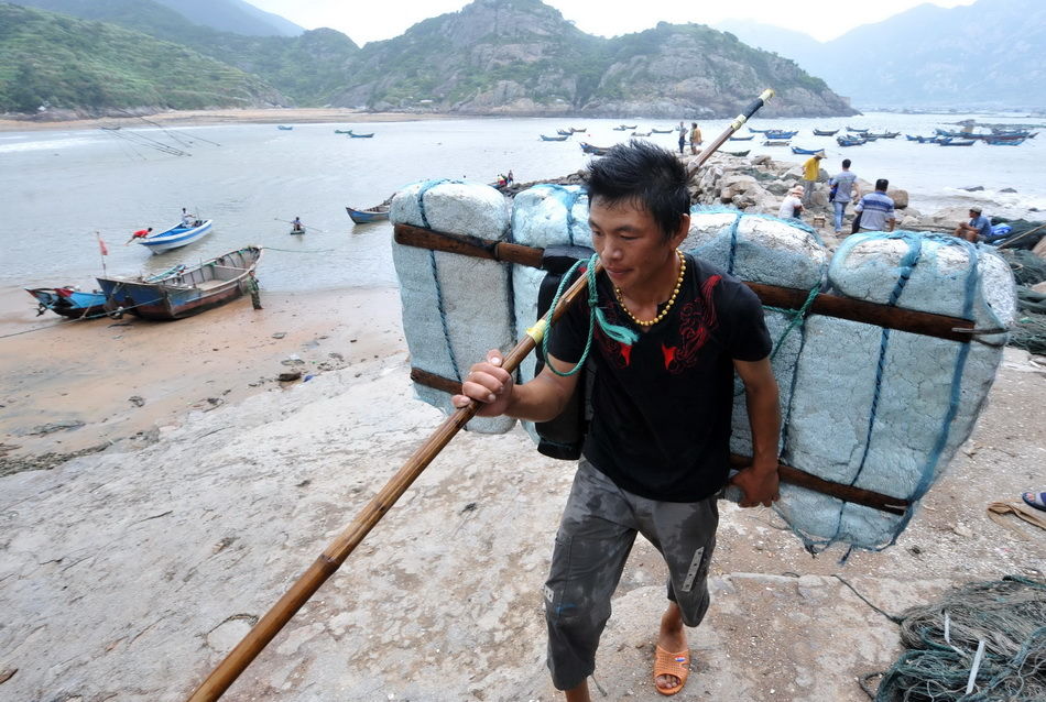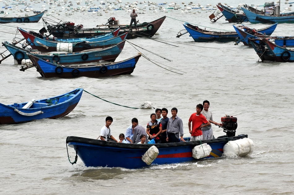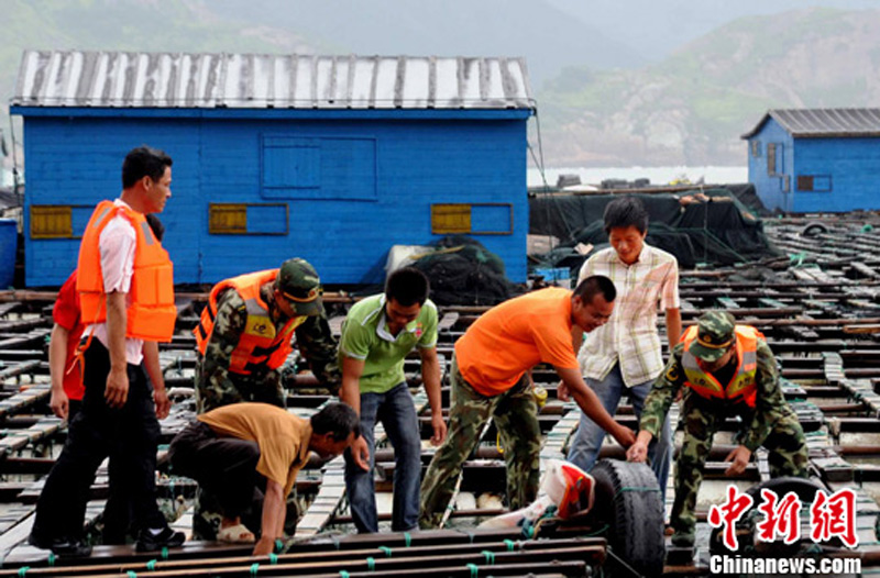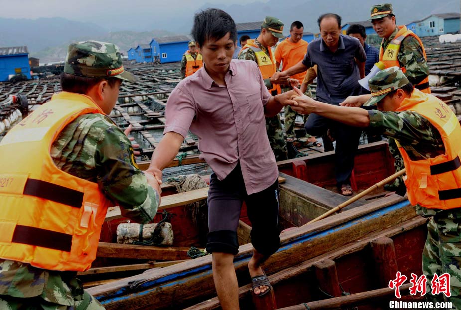 9月20日7時(shí),今年第11號(hào)臺(tái)風(fēng)“凡亞比”在福建省漳浦縣沿海登陸。圖為9月19日傍晚,福州連江縣邊防官兵冒著大風(fēng)幫助漁排養(yǎng)殖人員加固漁排并緊急轉(zhuǎn)移該縣可門(mén)海上養(yǎng)殖區(qū)內(nèi)漁排養(yǎng)殖人員。劉可耕 攝