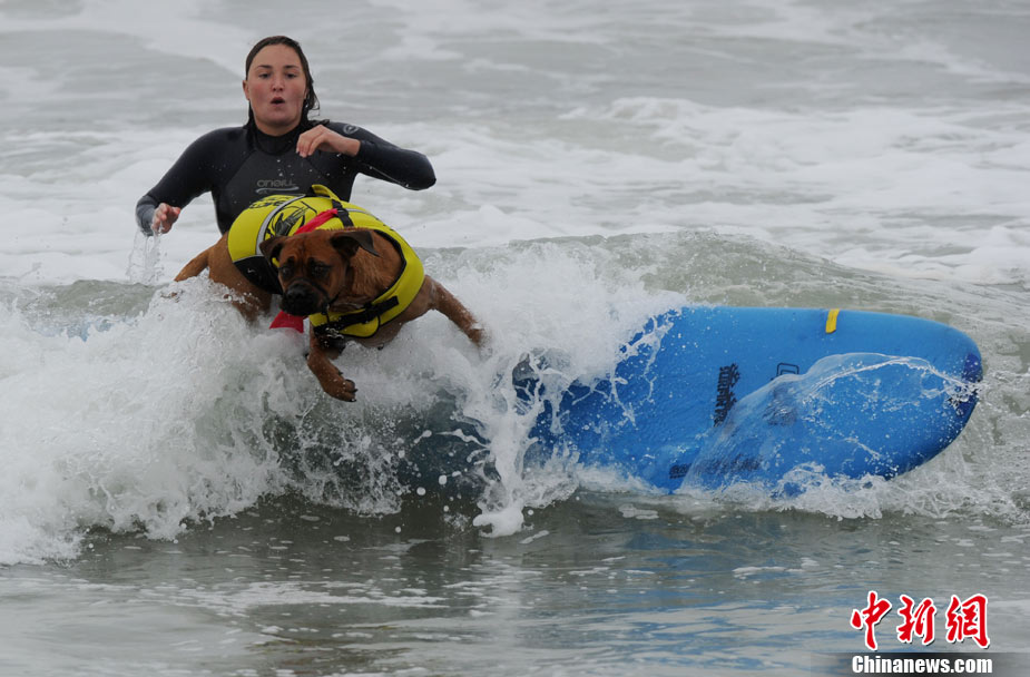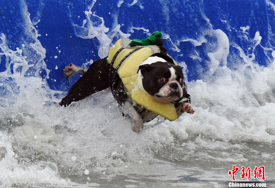 9月19日,在美國加利福尼亞州的亨廷頓比奇,可愛的狗狗們舉行了一場別開生面的沖浪大賽。