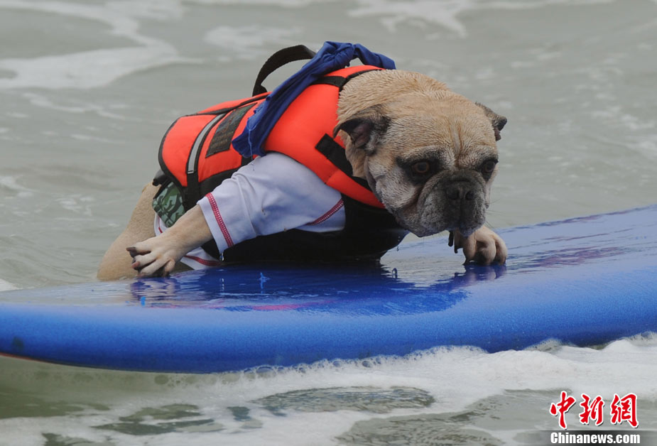 可愛狗狗扮沖浪高手 加州海灘競技