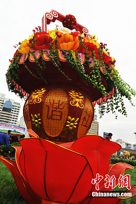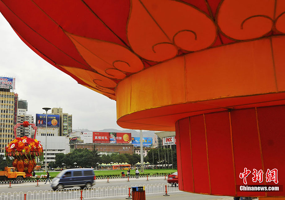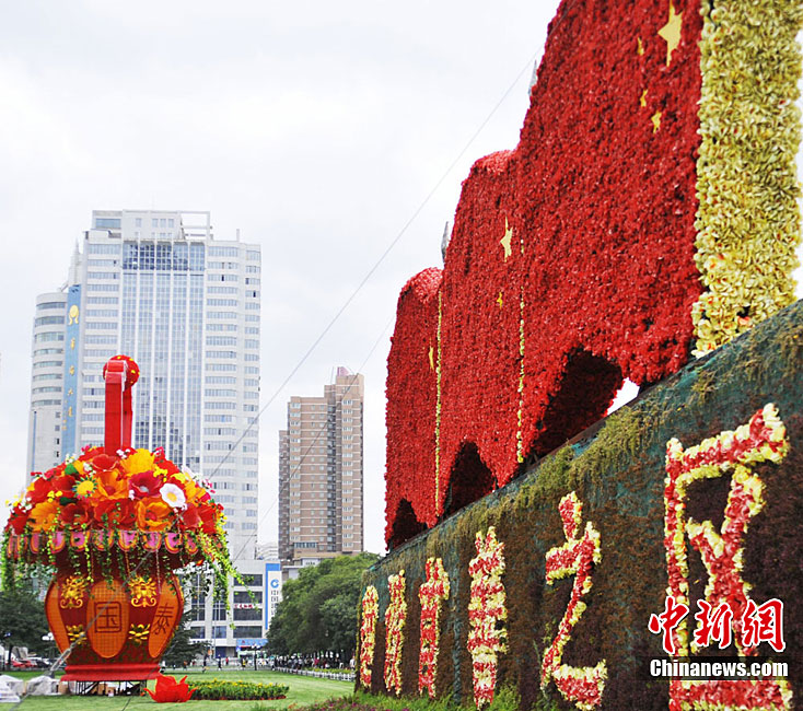 9月20日,中秋、國(guó)慶雙節(jié)即將到來,蘭州東方紅廣場(chǎng)布置一新,花籃上標(biāo)注有“和諧社會(huì)”與“國(guó)泰民安”。 楊艷敏 攝