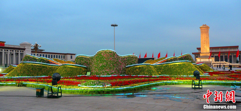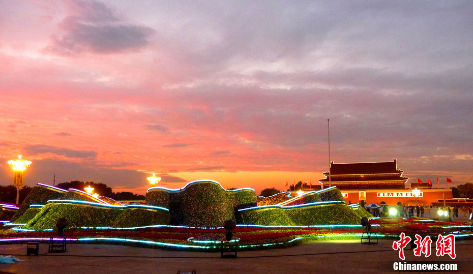 9月21日傍晚,北京天安門廣場(chǎng),剛剛布置完畢的國(guó)慶中心花壇首次調(diào)試景觀照明,綻放的“牡丹”與晚霞交相輝映。 中新社發(fā) 玉龍 攝 圖片來(lái)源:cnsphoto