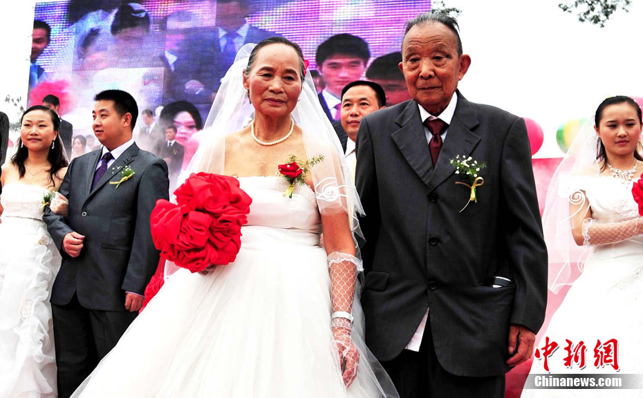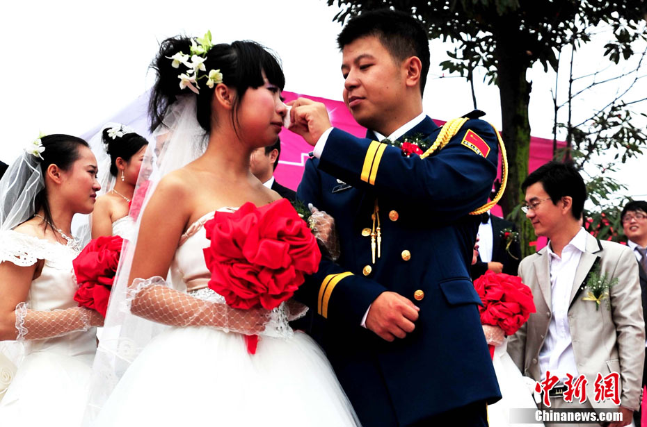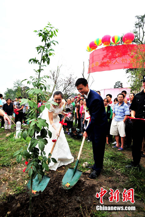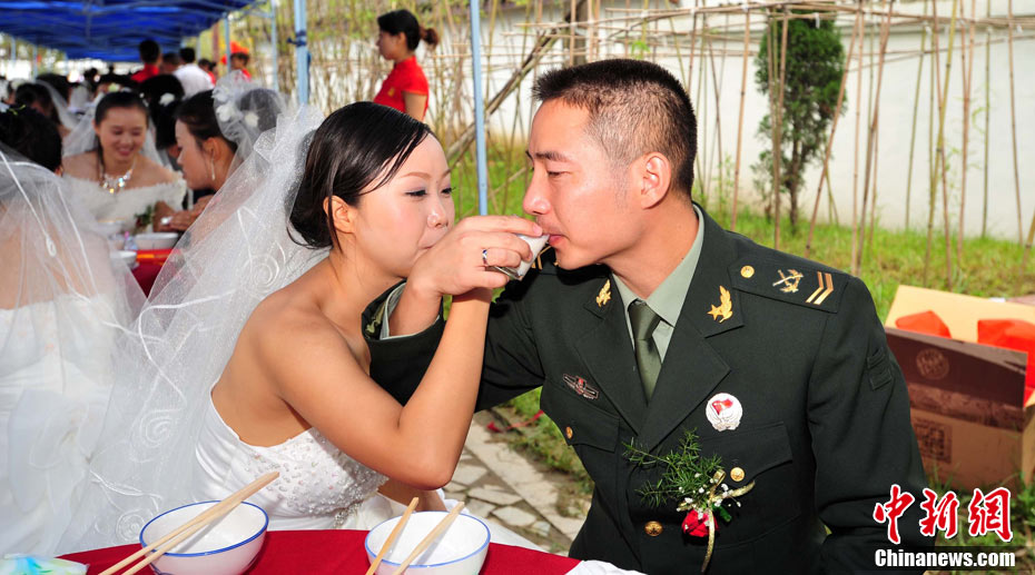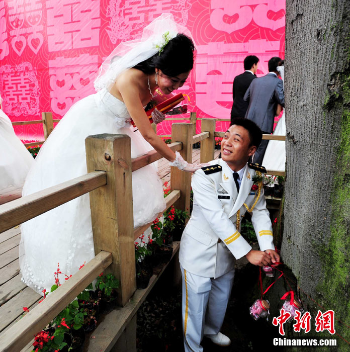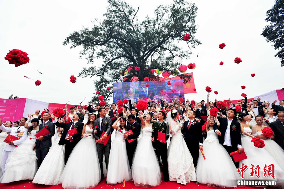 9月22日中秋佳節(jié)之際,99對參與過抗震救災(zāi)及災(zāi)后重建的新人,在四川省什邡市紅豆村的千年紅豆樹下,互許終身,共慶婚禮。圖為新人們在千年紅豆樹下見證愛情,同拋新娘捧花。中新社發(fā) 安源 攝