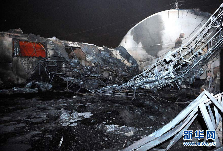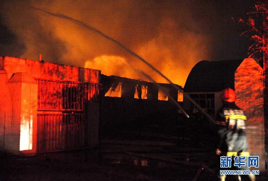 9月25日,消防官兵在火災(zāi)現(xiàn)場(chǎng)進(jìn)行撲救。當(dāng)日晚間,烏魯木齊國(guó)際機(jī)場(chǎng)跑道東側(cè)圍墻外一家“恒利擠塑板廠”發(fā)生火災(zāi)并有爆炸,由于有爆炸物散落到機(jī)場(chǎng)跑道,烏魯木齊國(guó)際機(jī)場(chǎng)關(guān)閉了一個(gè)小時(shí),清理跑道。圖片來(lái)源:新華網(wǎng) 王菲 攝