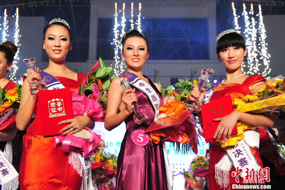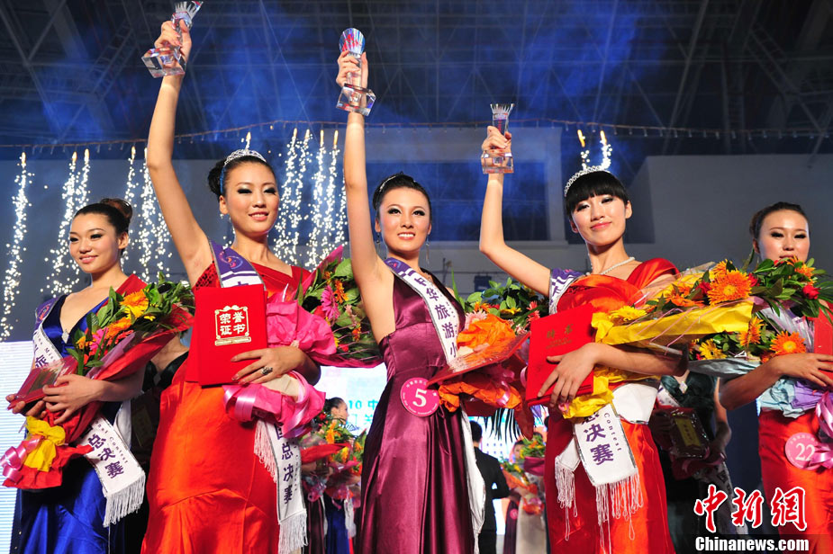 9月26日晚,2010中華旅游小姐大賽中國總決賽暨劍門關(guān)旅游形象大使選拔賽在四川省劍閣縣落下帷幕。40名佳麗們先后通過了熱情奔放的活力裝展示、風(fēng)情萬種的泳裝展示、雍容典雅的晚禮裝展示以及才藝表演、休閑裝展示后,經(jīng)評委們認真評判,最終本賽季8個單項獎、十佳選手以及佳麗三甲相繼產(chǎn)生。王子星、李彤、許亞楠分獲冠、亞、季軍,并獲得劍門關(guān)旅游形象大使的殊榮。中新社記者 李學(xué)仕 攝