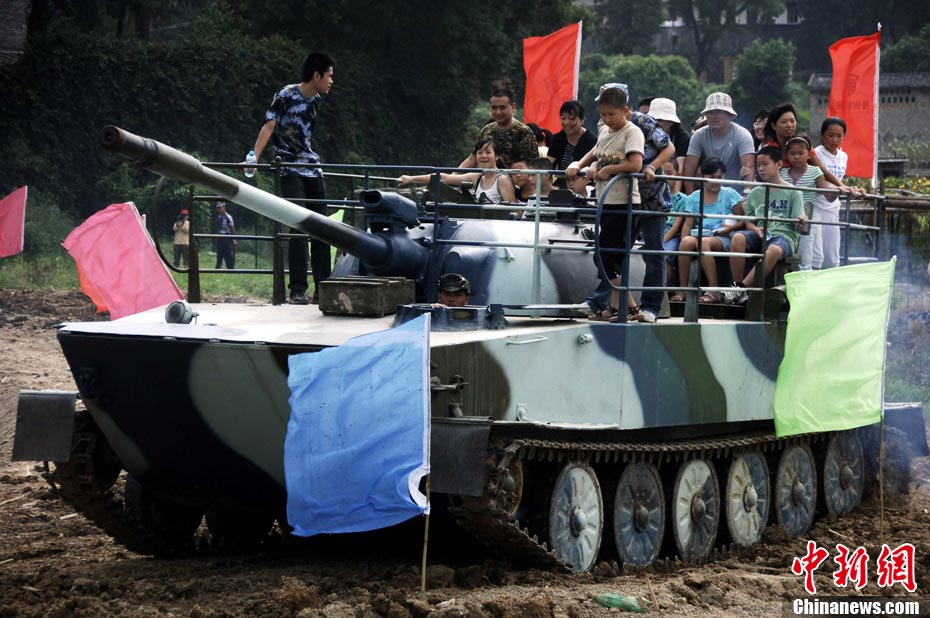 游客現(xiàn)場乘坐水陸兩用坦克。王東明 攝