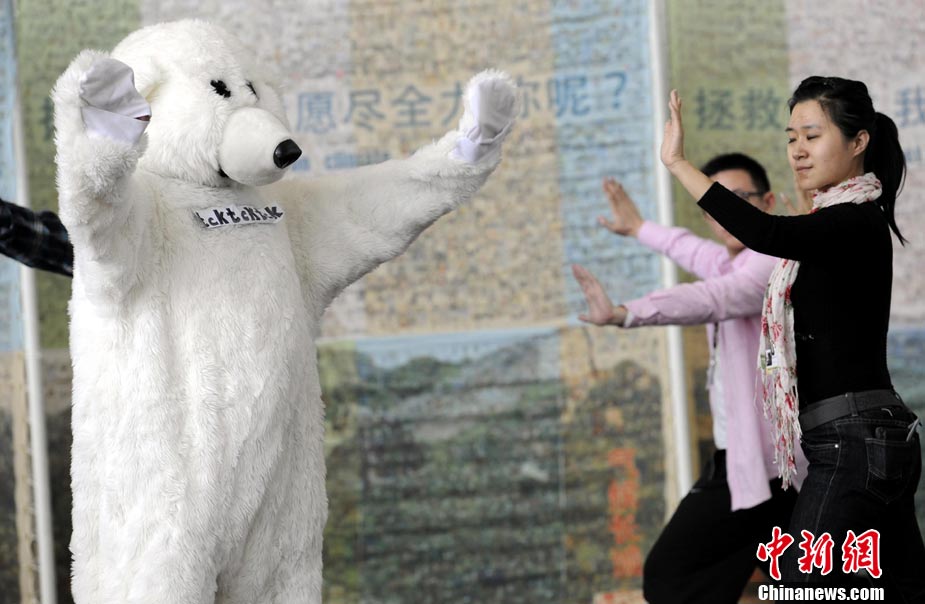 10月6日,聯(lián)合國氣候變化國際談判天津會(huì)議繼續(xù)舉行。全球氣候行動(dòng)聯(lián)盟(TckTckTck 運(yùn)動(dòng))特意安排了一個(gè)“北極熊”打太極的活動(dòng),邀請各國代表進(jìn)入會(huì)場之前加入打太極拳。希望這兩天談判各方達(dá)成一個(gè) “balanced package"(顧及各方利益的均衡協(xié)議),并以此警示人們愛護(hù)環(huán)境,拯救地球氣候。該組織由200個(gè)來自中國以及世界其他國家民間組織組成。 中新社記者 劉震 攝