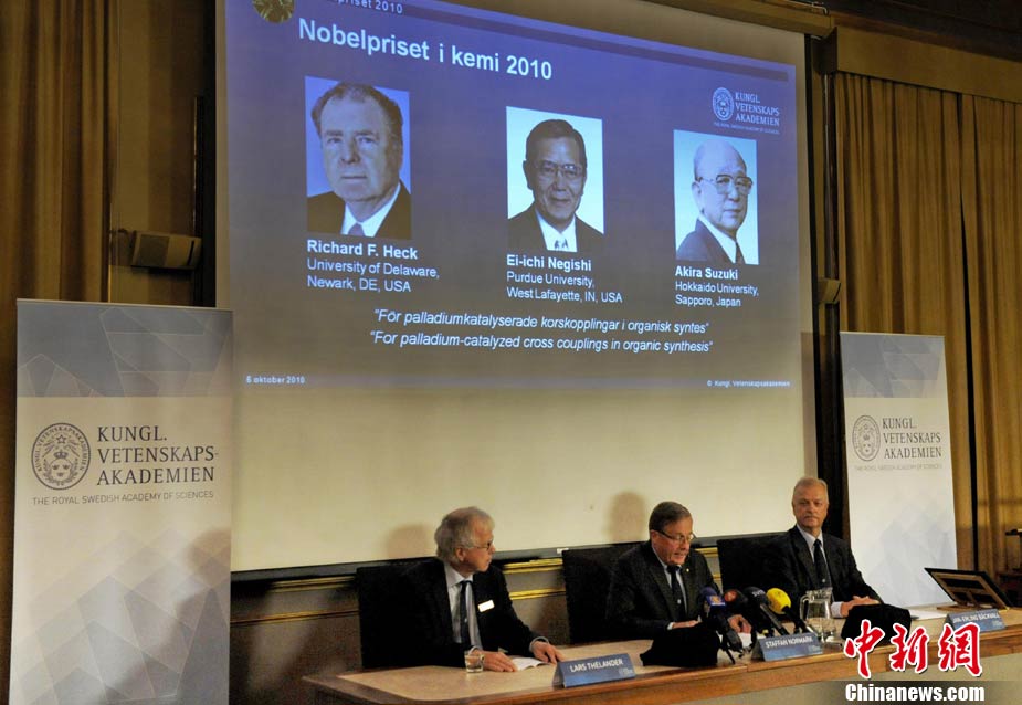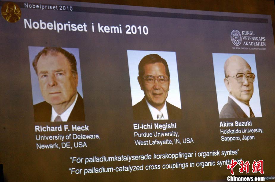 當(dāng)?shù)貢r(shí)間10月6日,瑞典皇家科學(xué)院宣布將2010年諾貝爾化學(xué)獎(jiǎng)授予美國科學(xué)家理查德-赫克、日本科學(xué)家根岸榮一和鈴木章。