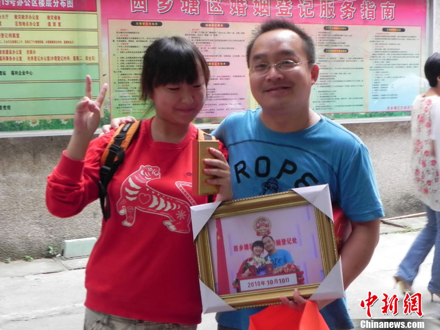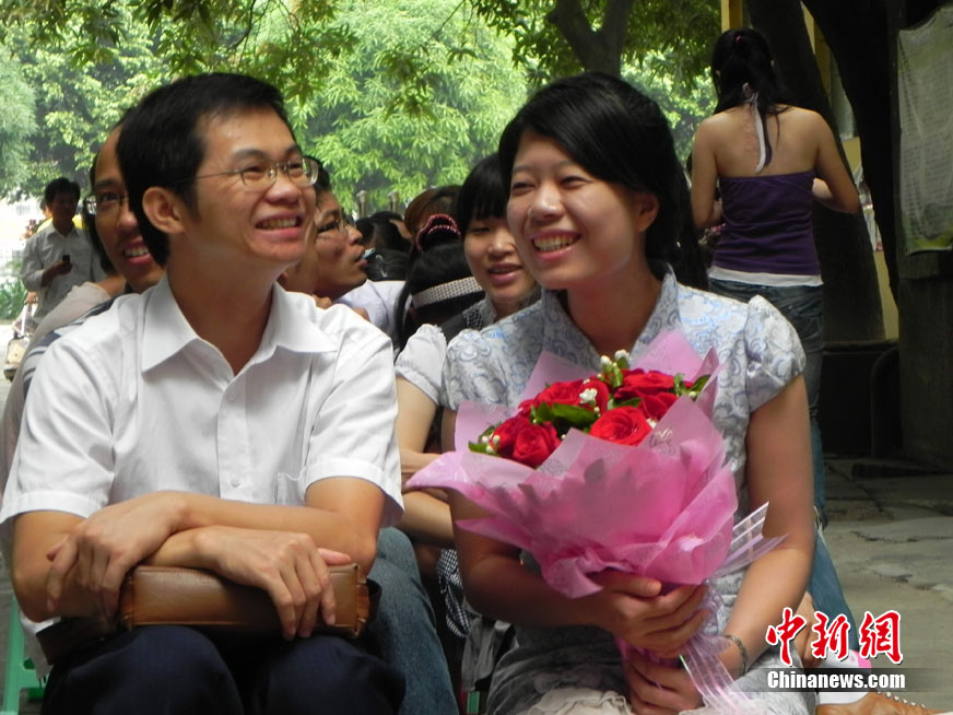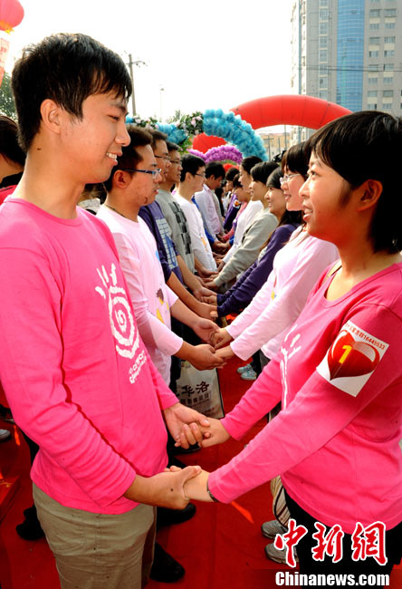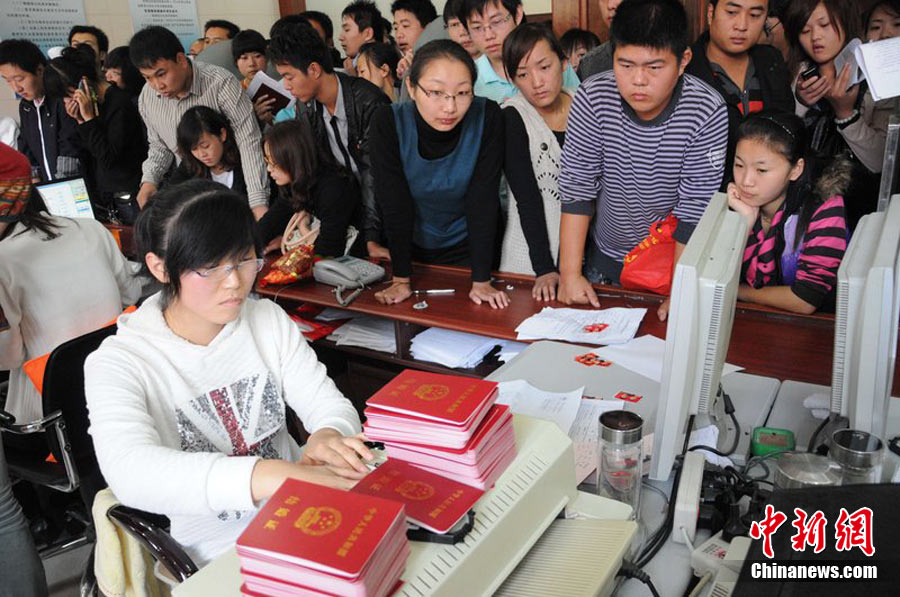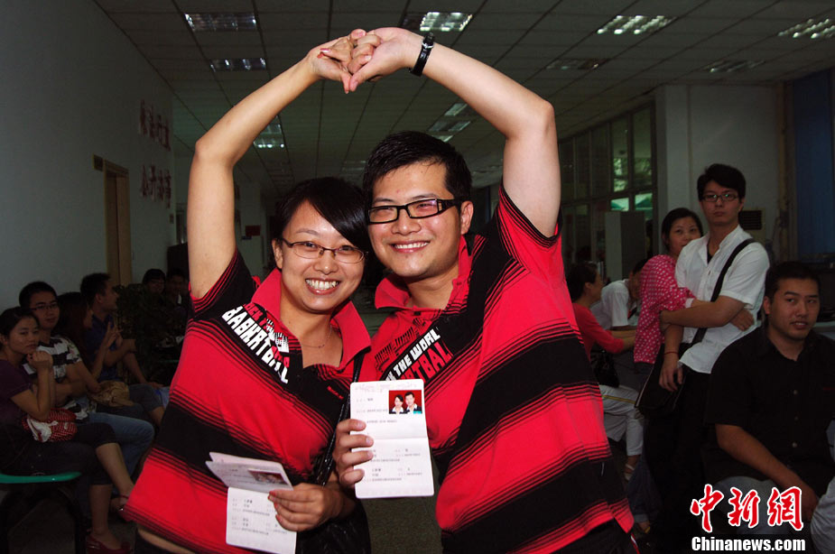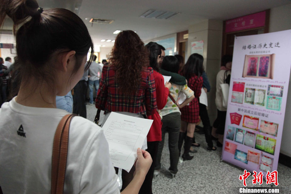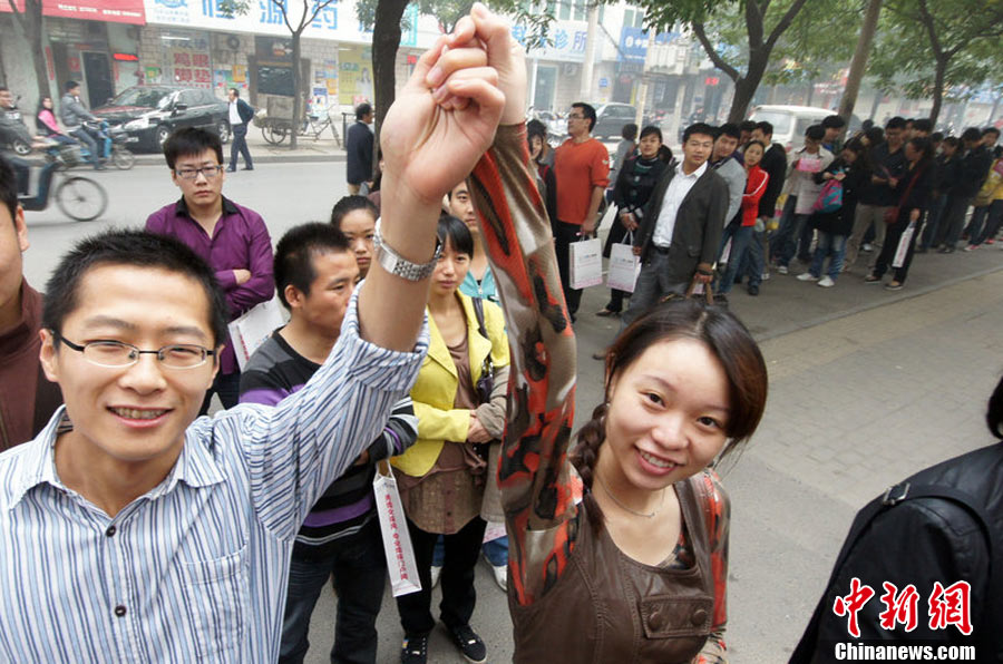 2010年10月10日,全國各地新人辦理結(jié)婚登記。很多新人選擇被寓意“十全十美”的好日子領(lǐng)結(jié)婚證。圖為鄭州出現(xiàn)結(jié)婚登記高峰,導(dǎo)致各區(qū)民政局婚姻登記處門前都排起長長的隊(duì)伍。一對新人在長長的隊(duì)伍中手挽手排除等候。沙浪 攝 圖片來源:CFP視覺中國
