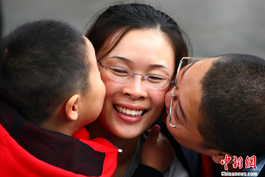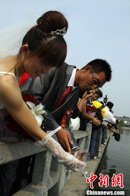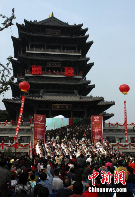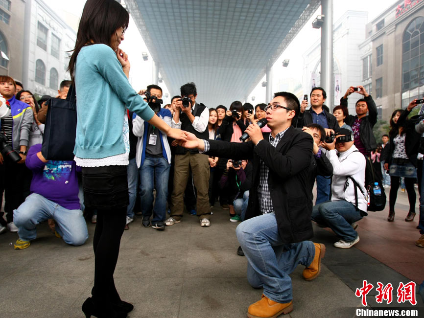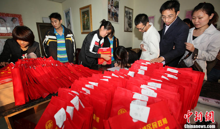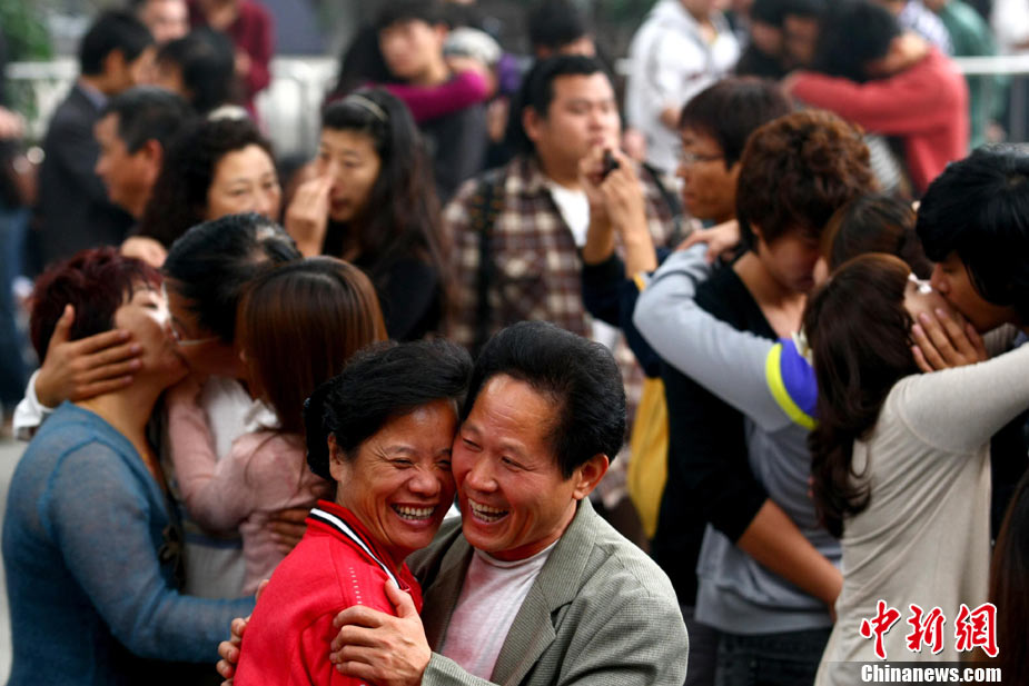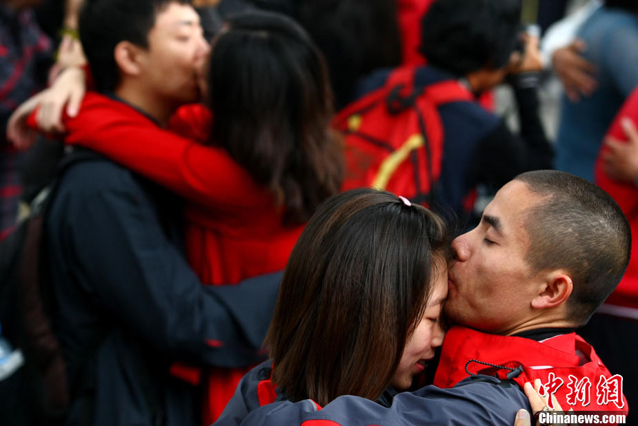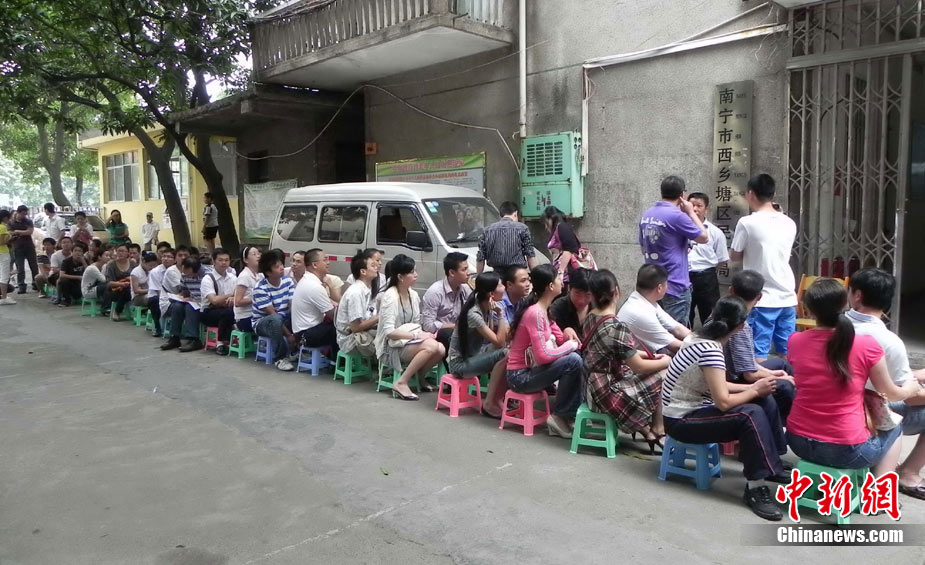 2010年10月10日,全國各地新人辦理結(jié)婚登記。很多新人選擇被寓意“十全十美”的好日子領(lǐng)結(jié)婚證。圖為鄭州出現(xiàn)結(jié)婚登記高峰,導(dǎo)致各區(qū)民政局婚姻登記處門前都排起長長的隊(duì)伍。一對新人在長長的隊(duì)伍中手挽手排除等候。沙浪 攝 圖片來源:CFP視覺中國