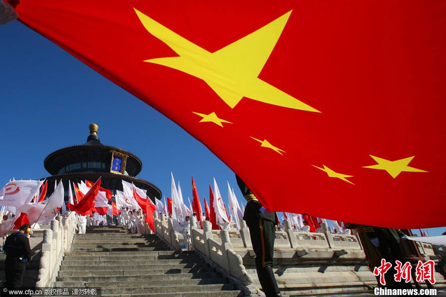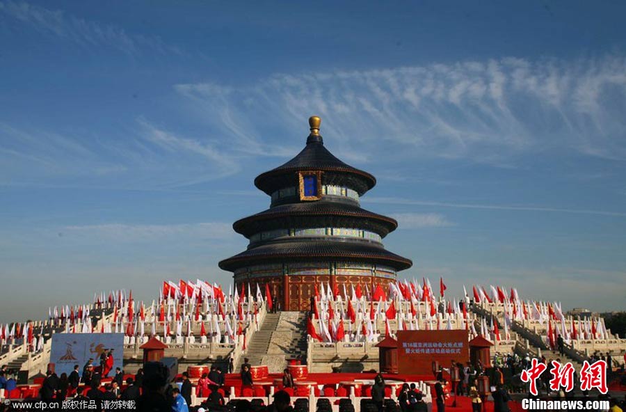 10月12日上午,廣州亞運(yùn)會(huì)火炬點(diǎn)燃暨傳遞啟動(dòng)儀式在北京天壇祈年殿南廣場舉行。10點(diǎn)17分,中共中央總書記、國家主席胡錦濤點(diǎn)燃主火炬。 中新社記者 沈晨 攝