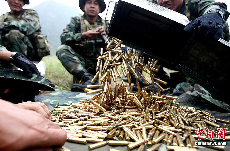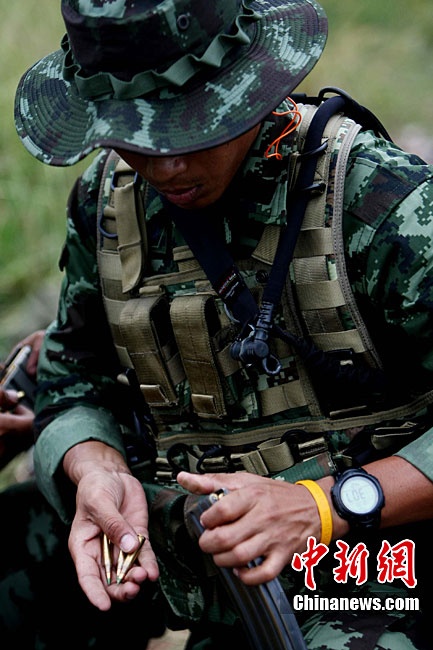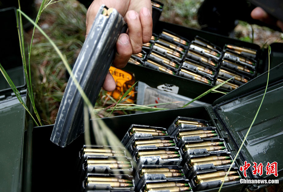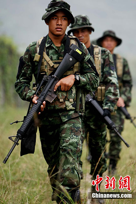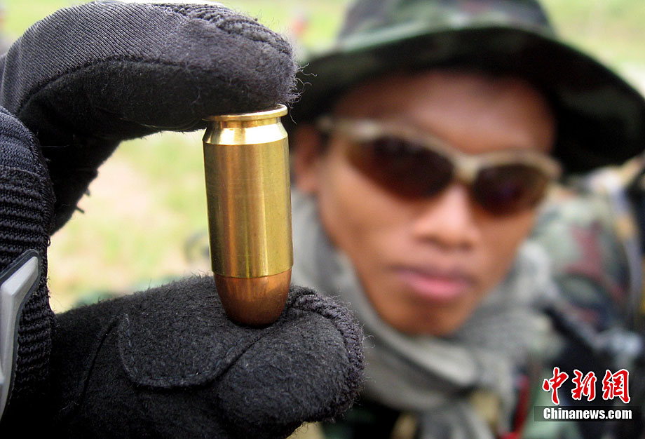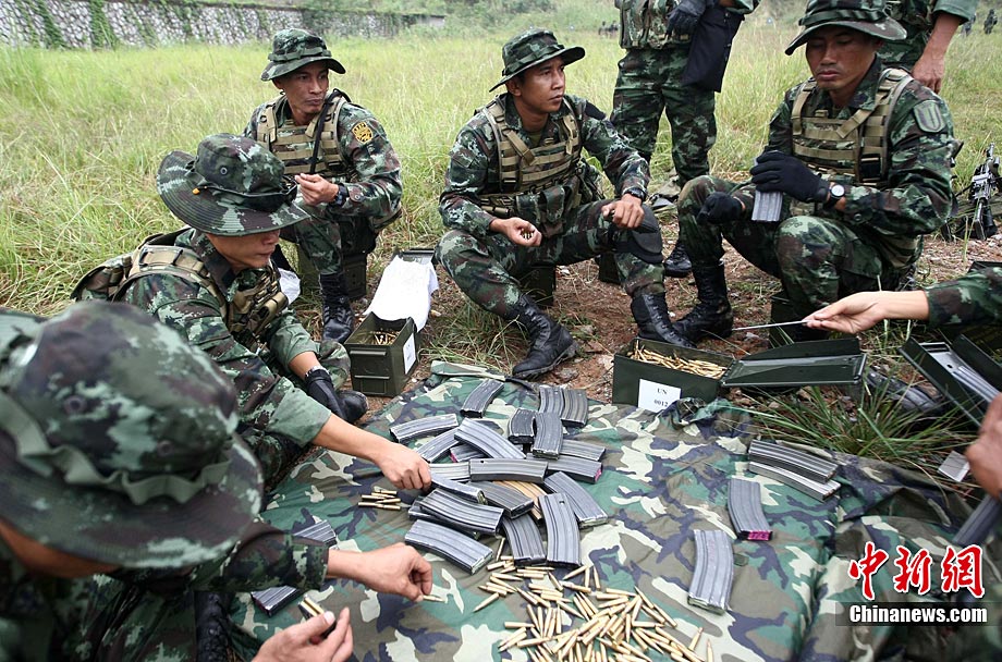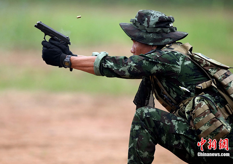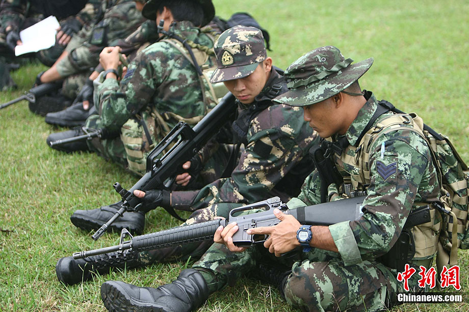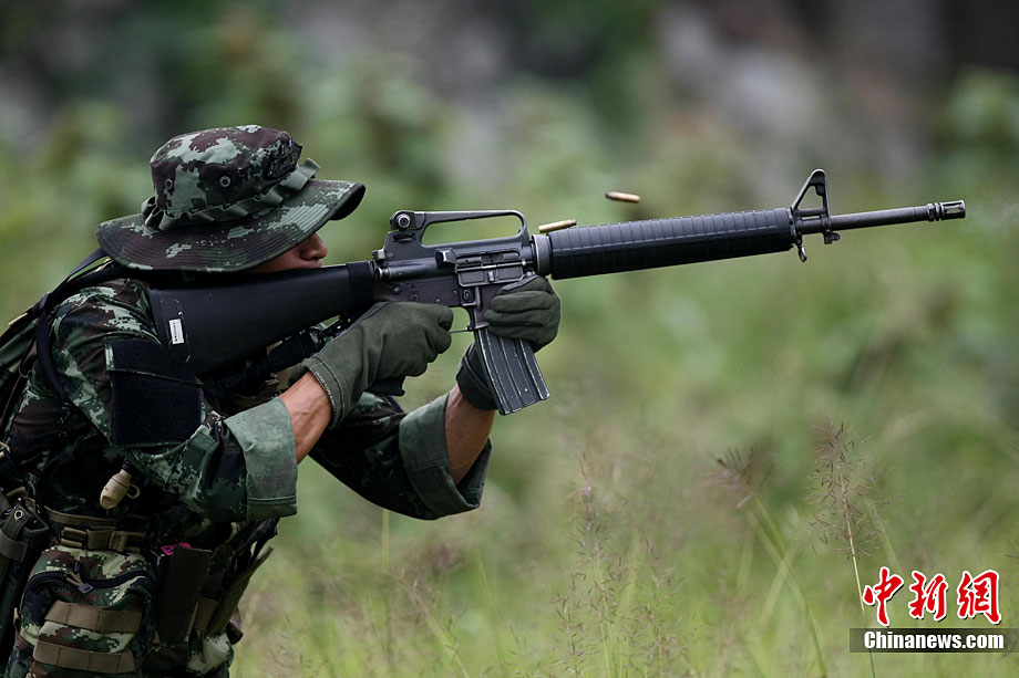 “突擊-2010”中泰陸軍特種部隊反恐聯(lián)合訓練10月6日至20日在廣西壯族自治區(qū)桂林進行。中泰雙方將各派出60余人的特種分隊參加訓練。此次聯(lián)合訓練分展示交流、混編同訓和綜合演練三個階段,主要圍繞城市反恐基礎技能訓練、混編分隊戰(zhàn)術訓練等科目進行。圖為泰方隊員M16步槍實彈速射。中新社記者 杜洋 攝