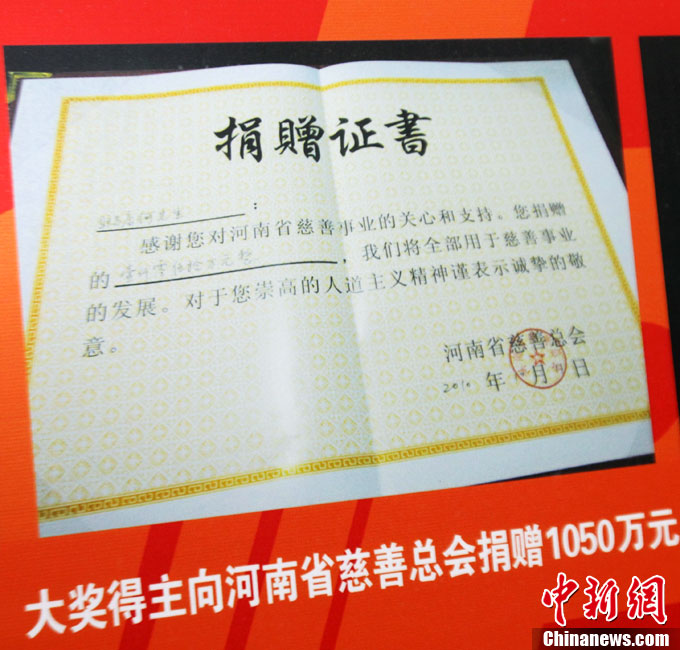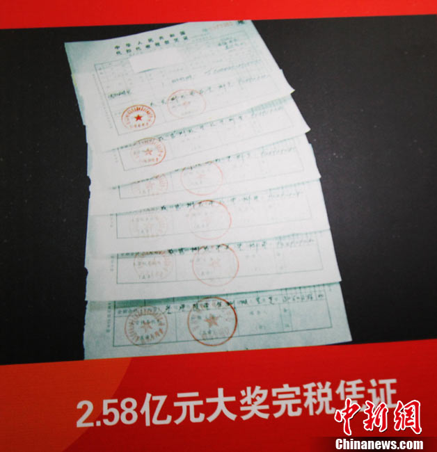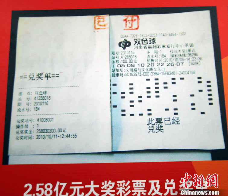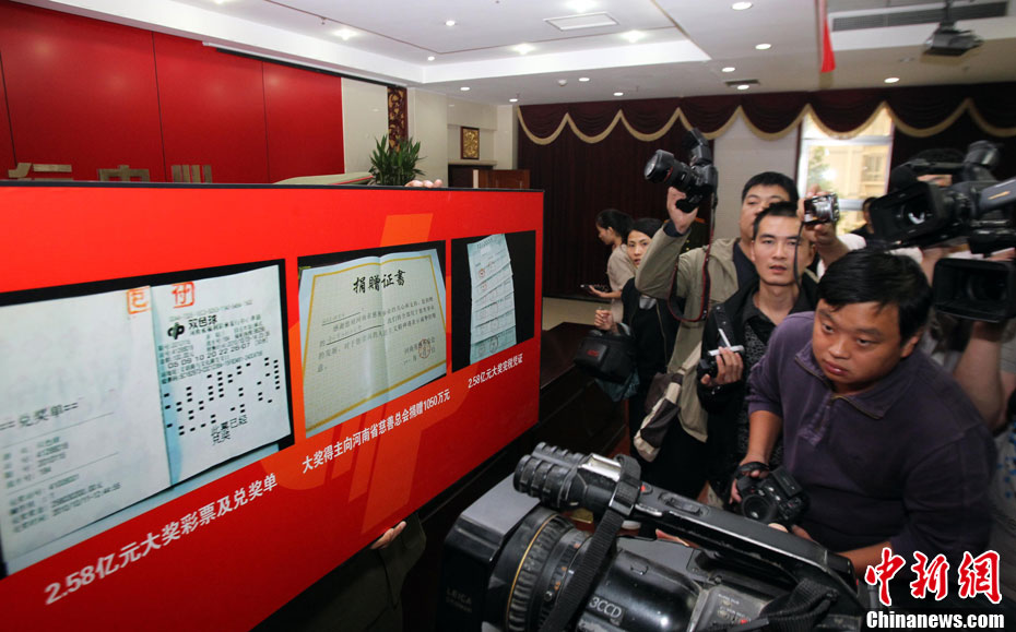10月13日,河南福彩中心召開新聞發(fā)布會通報雙色球2.58億兌獎情況,2.58億巨獎彩票在發(fā)布會上曝光。巨獎于本周一被兌取,得主是一位長期從事教育職業(yè)的駐馬店本地人,他的大獎為機(jī)選1注后50倍投,他將捐款1050萬,為目前中國彩市大獎得主單筆最高捐款。2.58億是繼2009年安陽彩民獲3.59億后,河南彩民攬獲的又一個超級巨獎。中新社記者 王中舉 攝