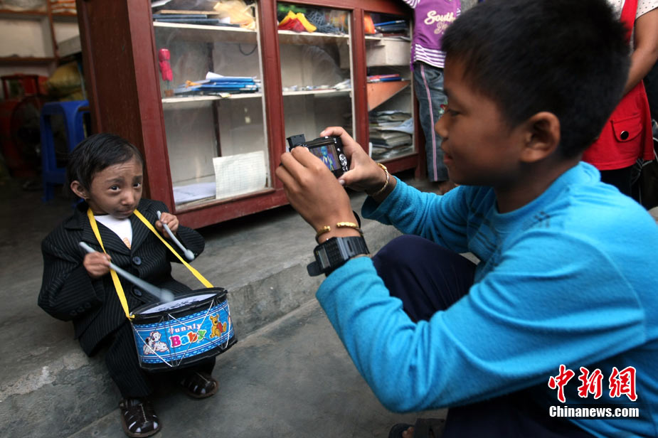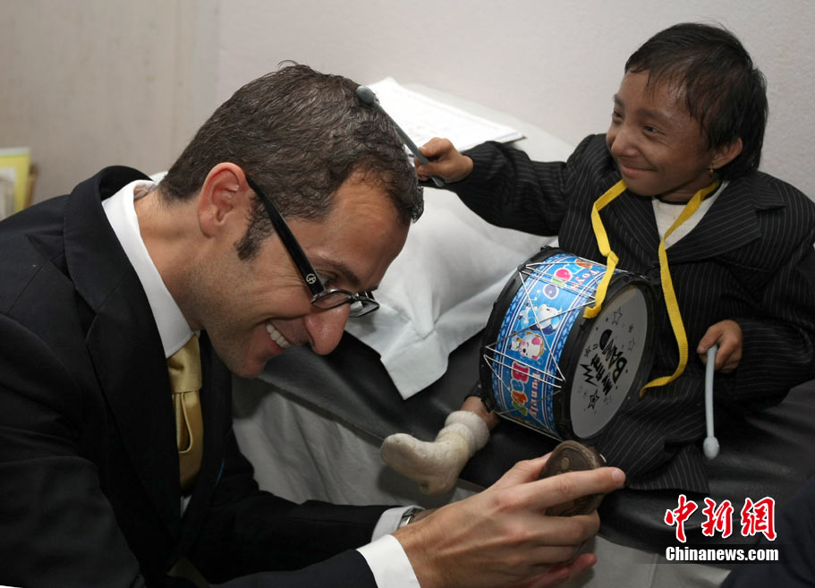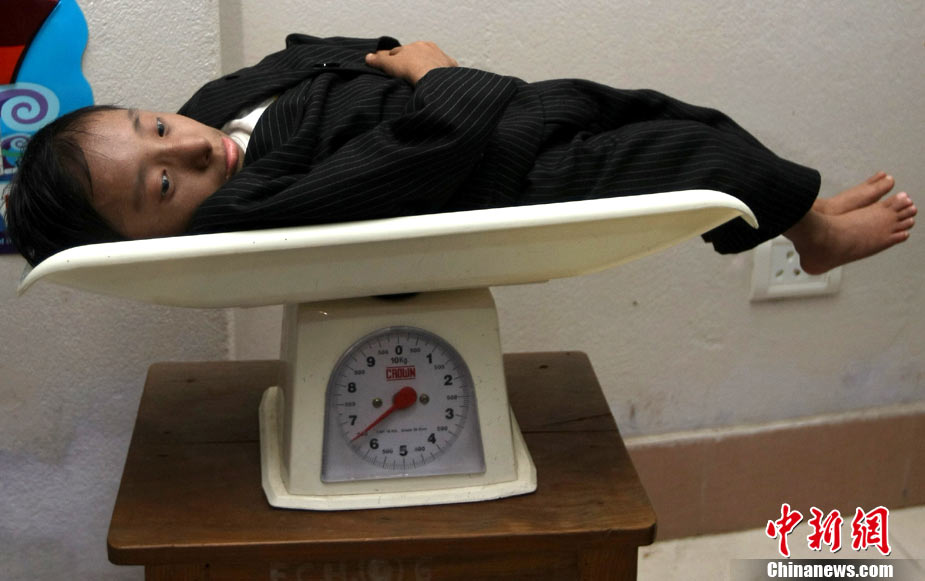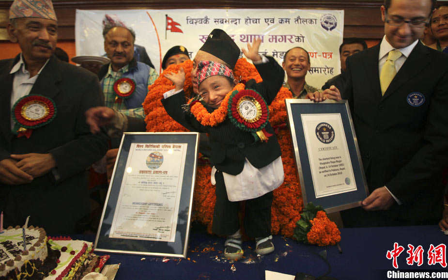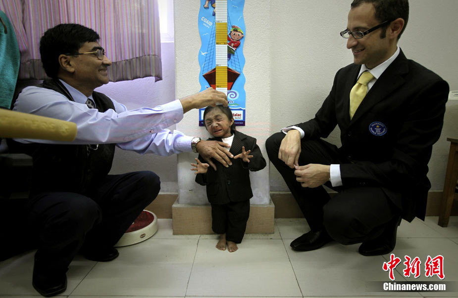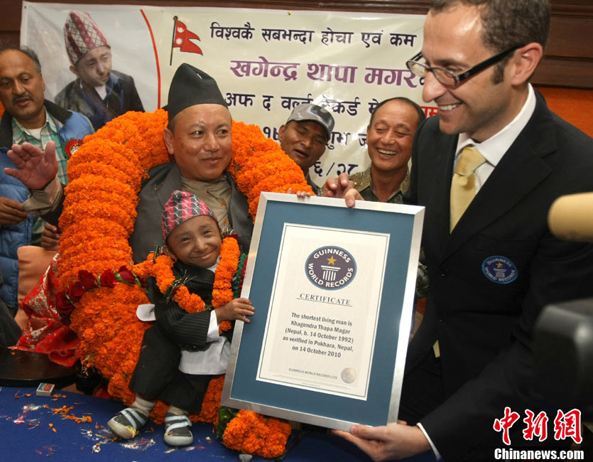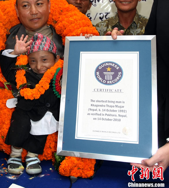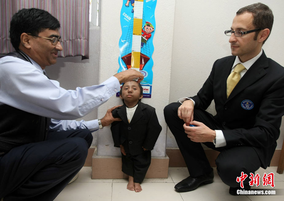 10月14日,在尼泊爾中部小城博克拉,一名尼泊爾醫(yī)生在《吉尼斯世界紀錄大全》工作人員的見證下為18歲的卡根德拉·塔帕·馬加爾測量身高。馬加爾出生于1992年10月14日,現(xiàn)在身高65.53厘米,體重5.45公斤。今天,馬加爾成年,從而打破全球成人最矮身高紀錄。