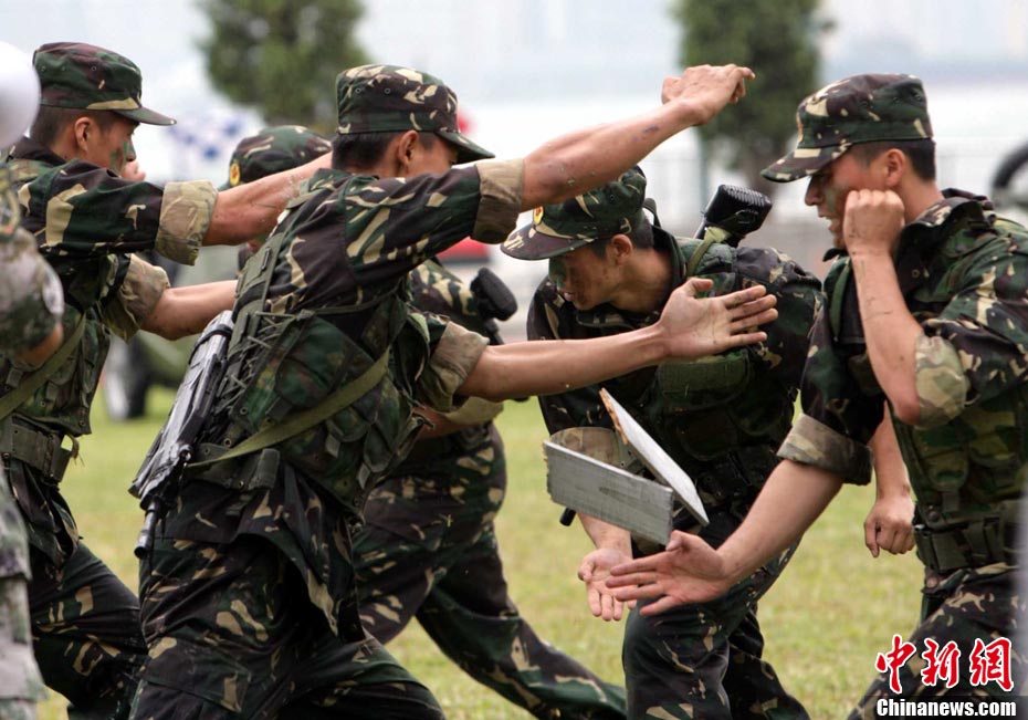 10月16日,中國(guó)人民解放軍駐港部隊(duì)特種兵在香港昂船洲海軍基地進(jìn)行“獵人戰(zhàn)斗”演練,展示過(guò)硬的搏擊功夫。當(dāng)天,駐軍與香港各大院校大學(xué)生聯(lián)誼活動(dòng),以各種形式相互交流,增進(jìn)香港學(xué)生對(duì)國(guó)家的了解。 中新社發(fā) 洪少葵 攝