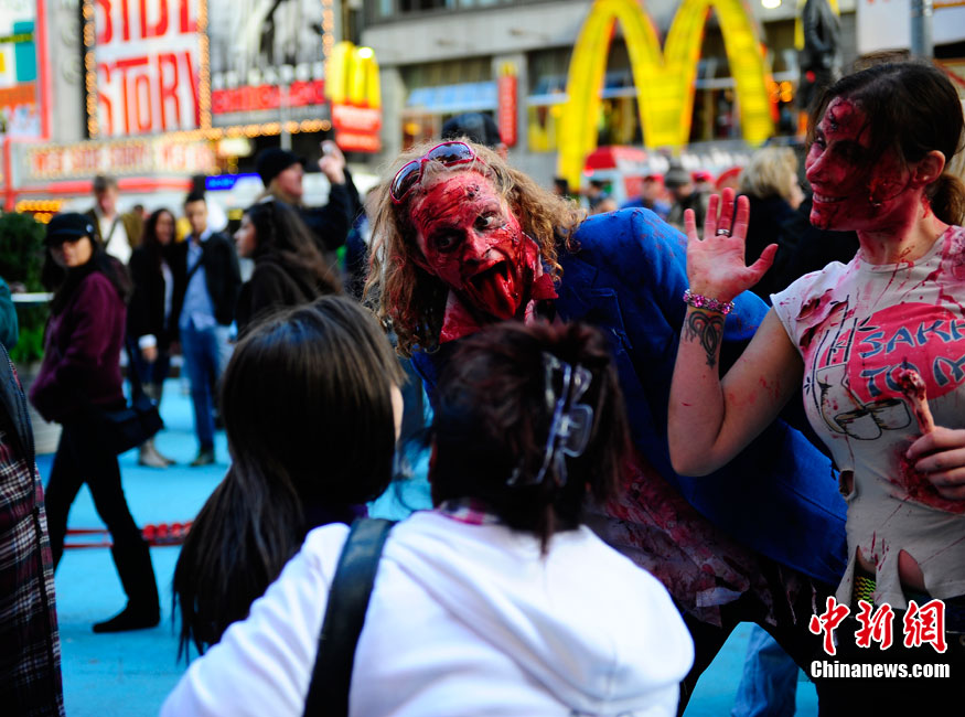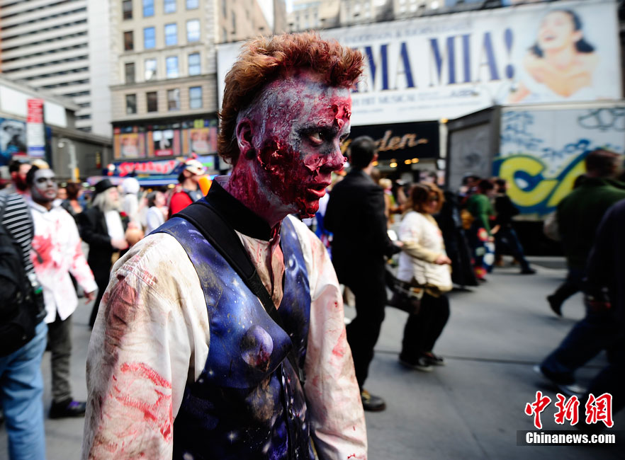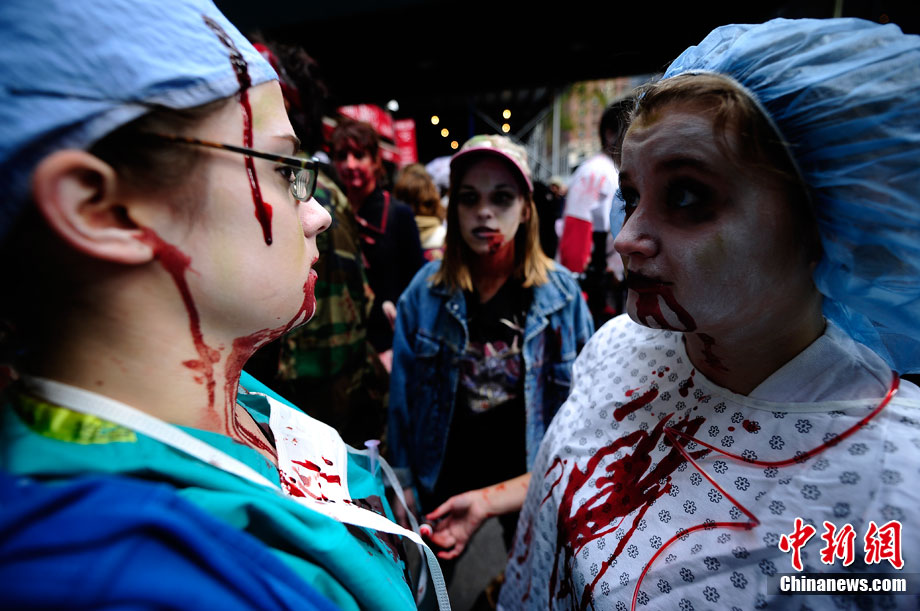 當(dāng)?shù)貢r(shí)間10月16日,美國紐約曼哈頓舉行了盛大的僵尸大游行。數(shù)百名狂歡者將自己打扮成僵尸模樣嚇唬路上的民眾。