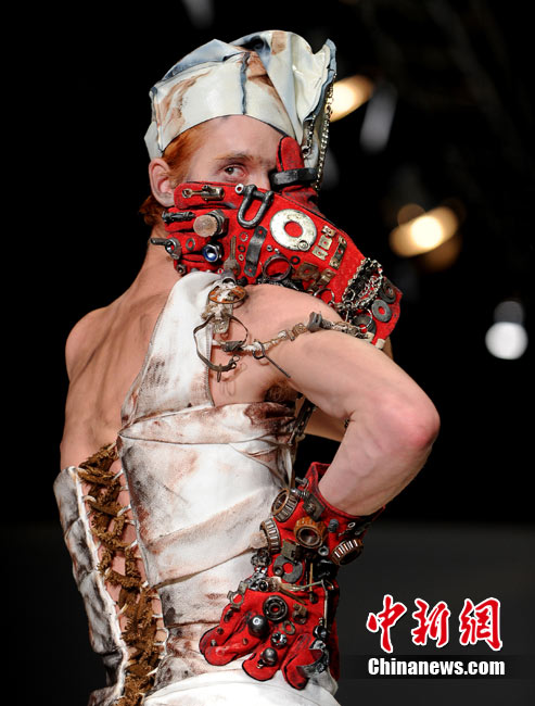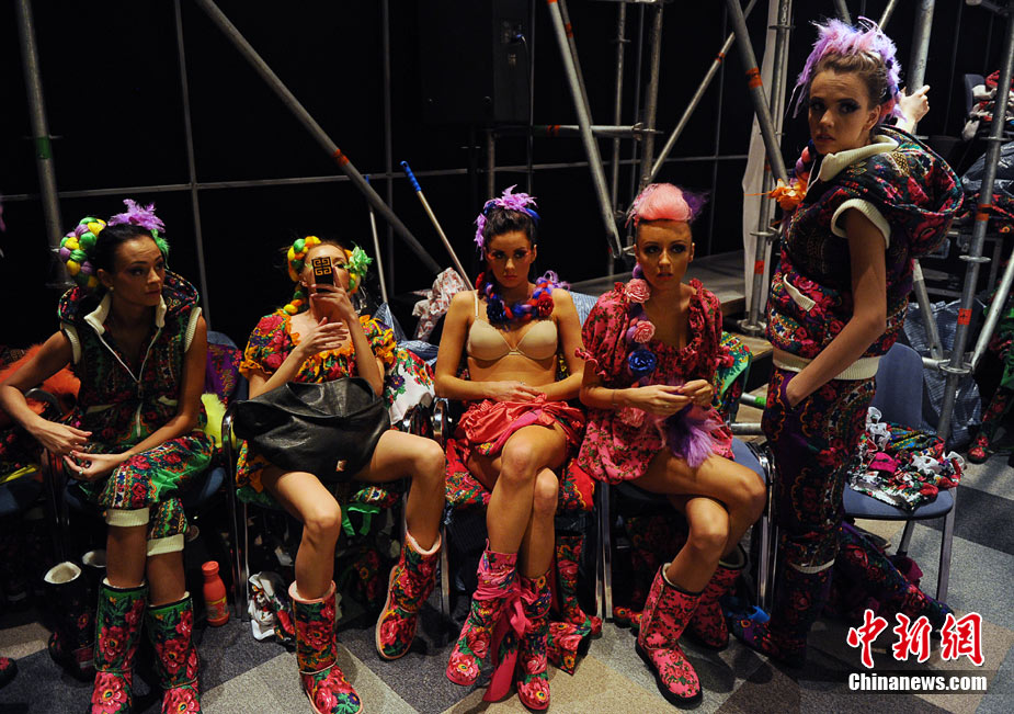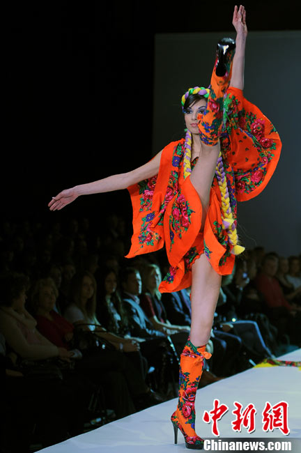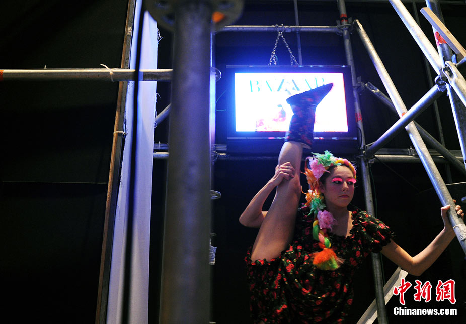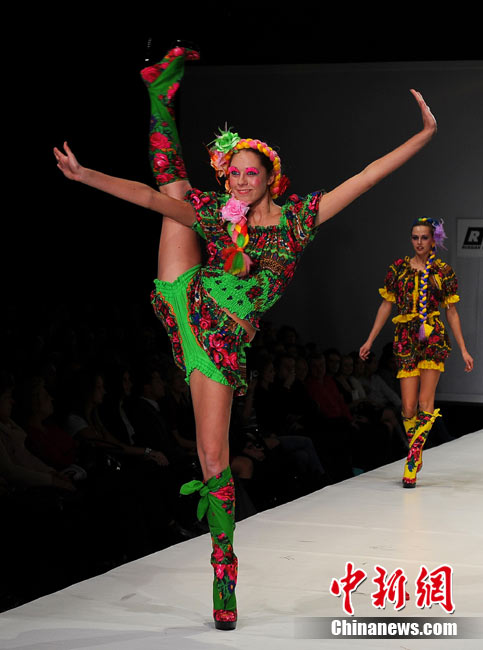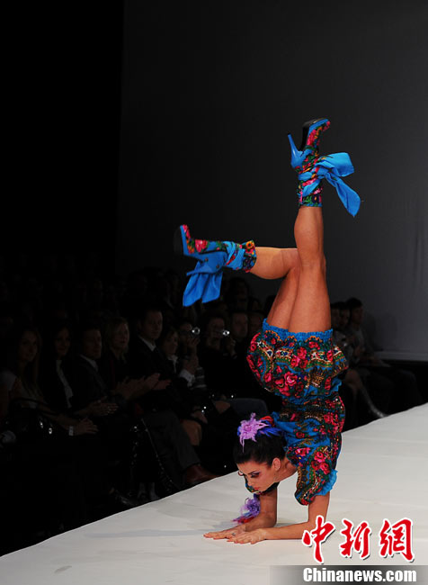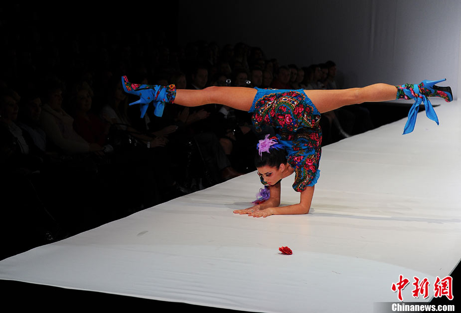 10月18日,莫斯科,在2011俄羅斯春夏時(shí)裝周上舉行了一場(chǎng)別開(kāi)生面的時(shí)裝秀,眾多靚模用一些高難度動(dòng)作展示潮流服飾。