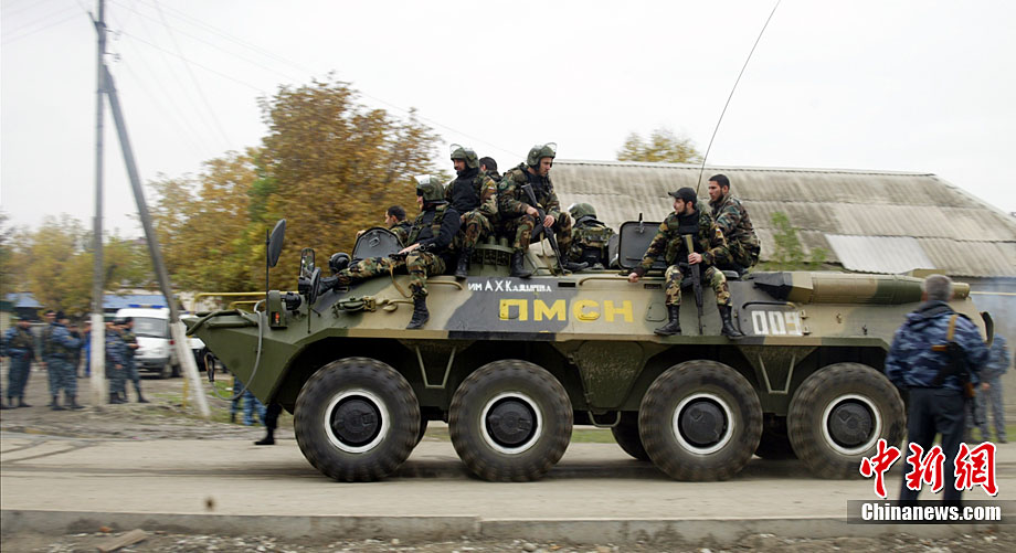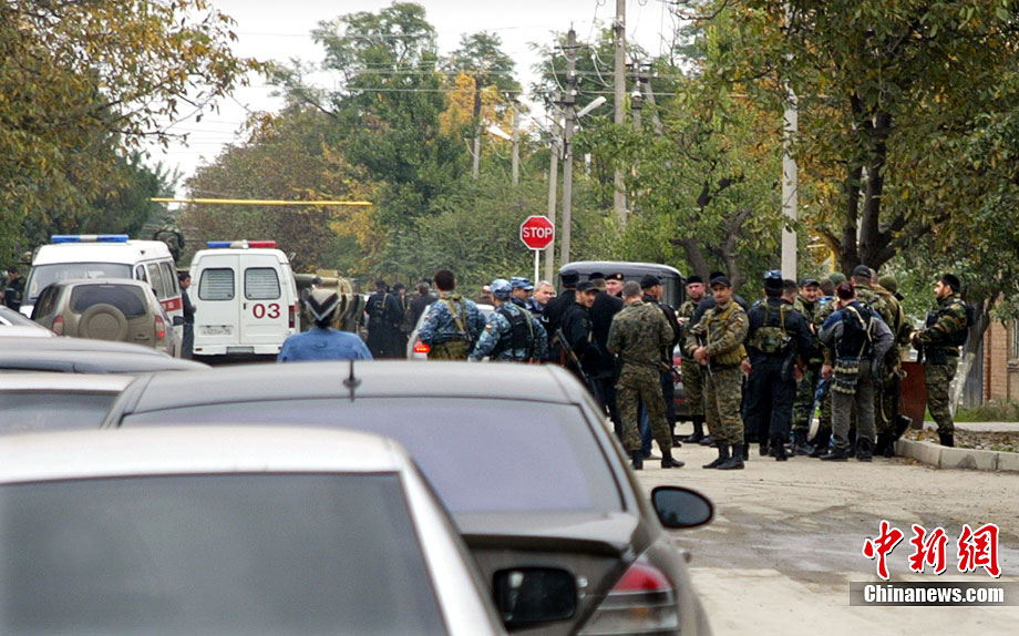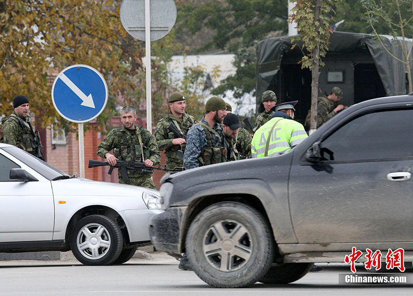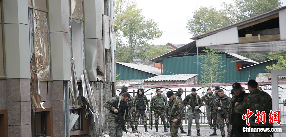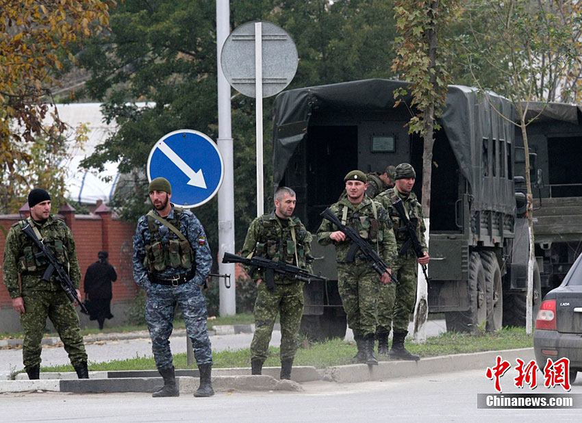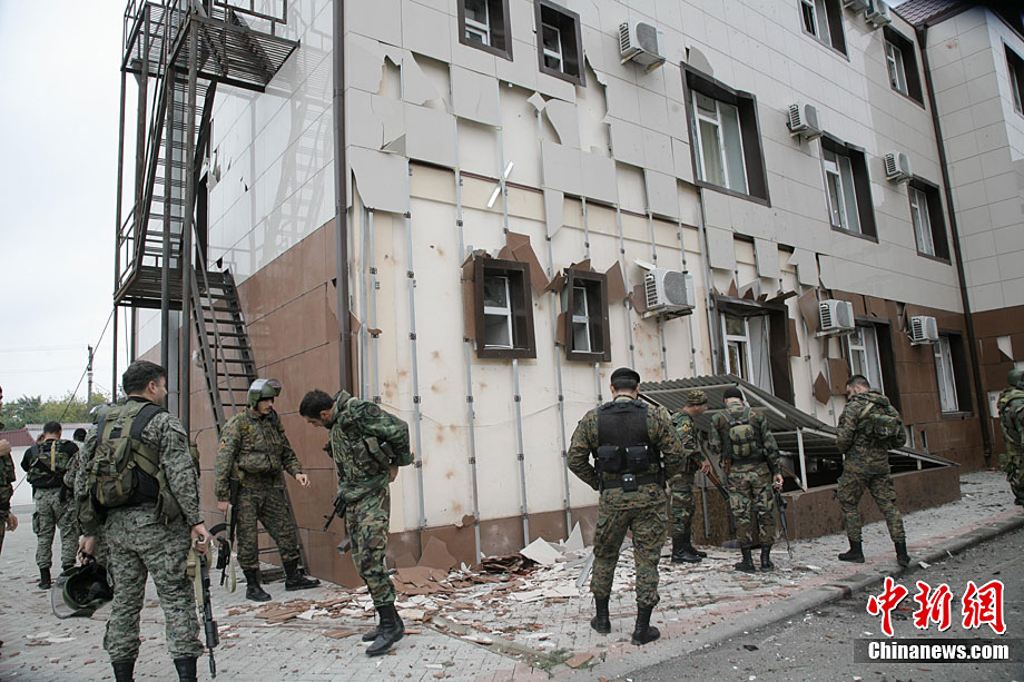 當(dāng)?shù)貢r間10月19日,俄羅斯車臣共和國首府格羅茲尼市列寧區(qū)的車臣議會大樓遭到武裝分子襲擊,造成2人死亡。圖為安全部隊在消滅完襲擊份子后,準(zhǔn)備撤離議會大樓。