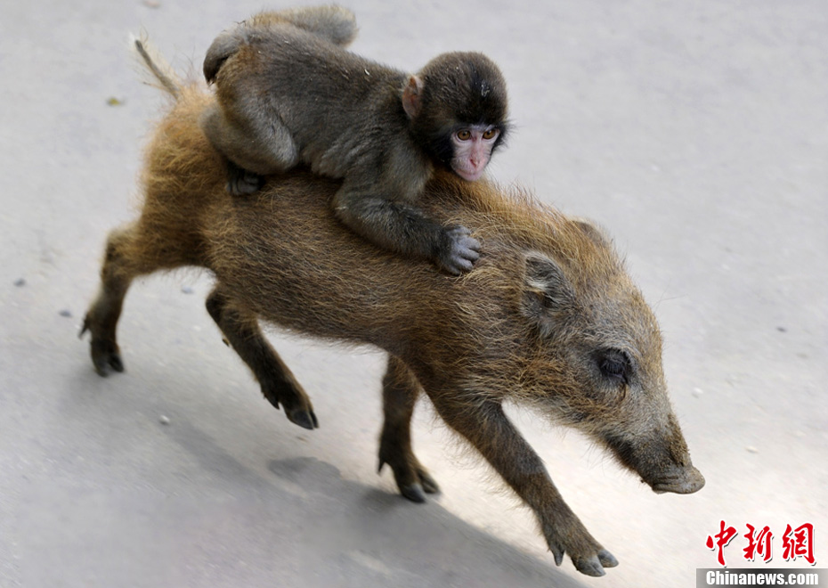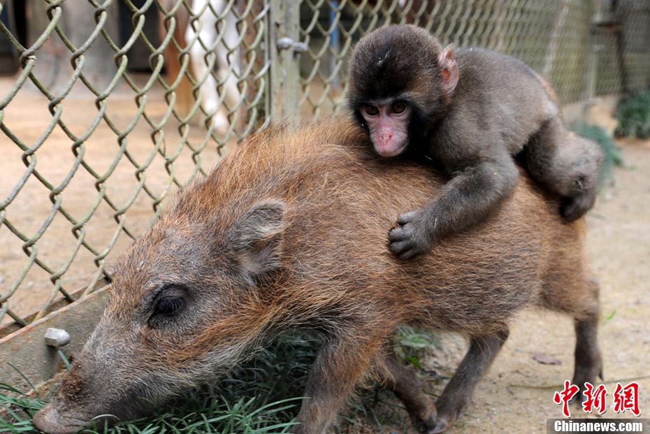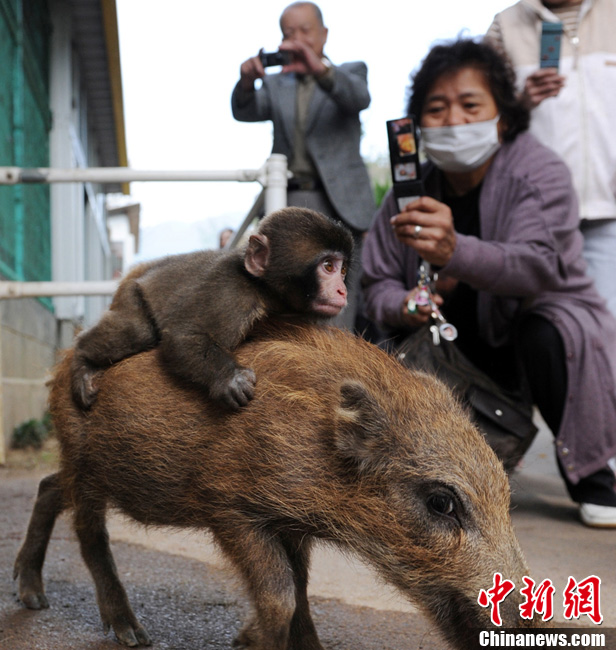 10月19日,日本京都轄區(qū)內(nèi)的福知山動物園里,兩只小動物成了大家眼中的明星:名叫Uribo的小公野豬經(jīng)常馱著小猴子Miwa跑來跑去,吸引大量游客前來觀看,并且給它們拍照。他們都是失去了母親的孤兒,福知山動物園將他們收養(yǎng)。