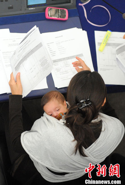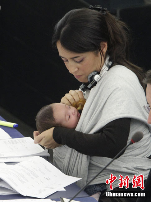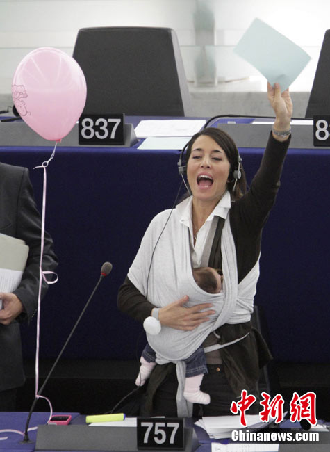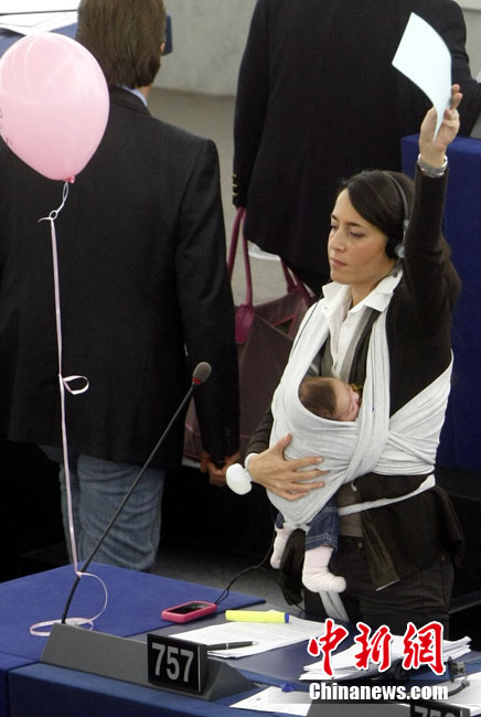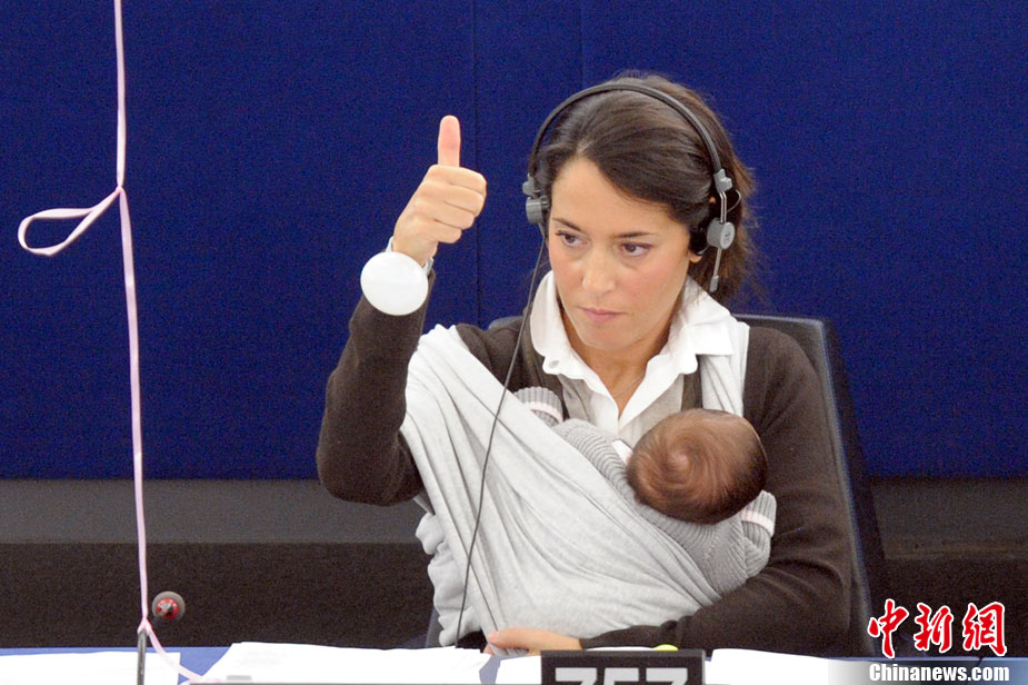 10月20日,歐洲議會(huì)在法國(guó)的斯特拉斯堡為延長(zhǎng)產(chǎn)假的提案舉行投票,代表麗希亞·隆蘇依帶著孩子出席會(huì)議。
