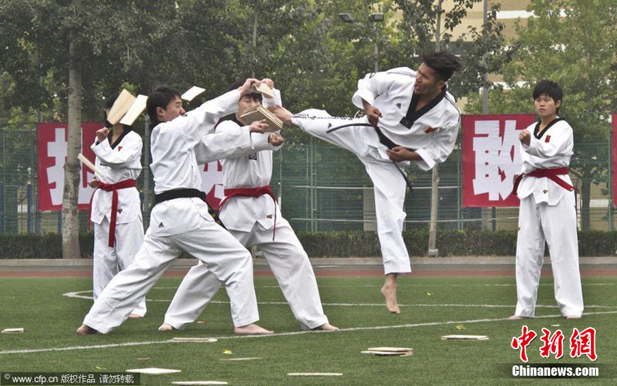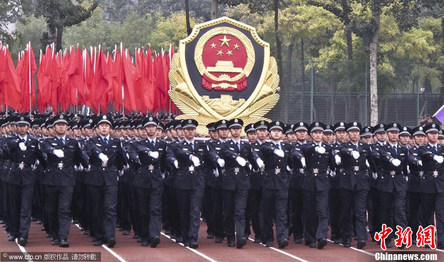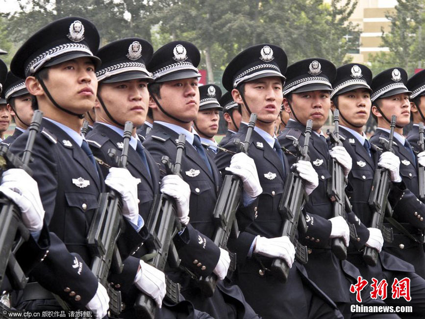 2010年10月20日,中國人民公安大學(xué)新生開學(xué)儀式在北京大興校區(qū)舉行,數(shù)百位家長親臨現(xiàn)場,觀摩了孩子們在開學(xué)典禮上的表演。圖為女生們表演匕首制敵的招數(shù)。蒲東峰 攝 圖片來源:CFP視覺中國