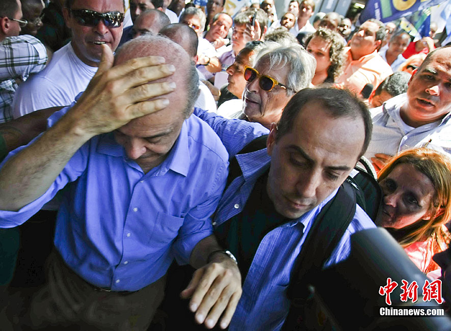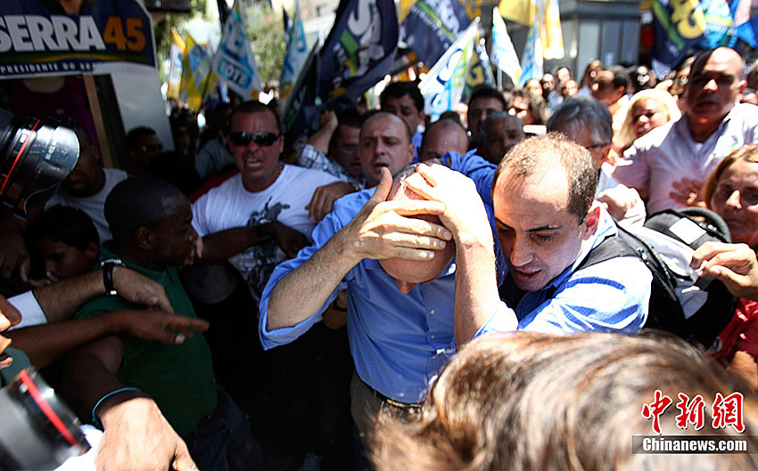 當?shù)貢r間10月20日,在巴西里約熱內(nèi)盧以西,社會民主黨總統(tǒng)候選人若澤·塞拉在參加一場競選宣傳活動時被不明投擲物擊中頭部,隨后在安保人員和支持者的護送下離開了現(xiàn)場。