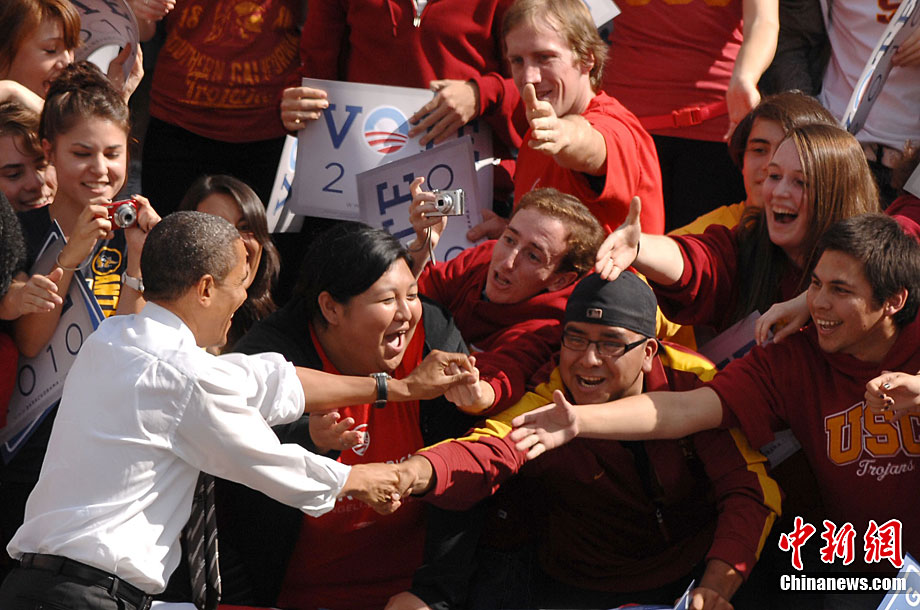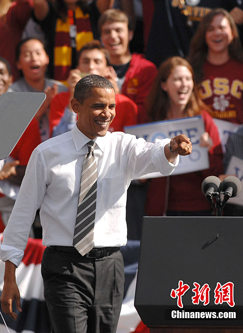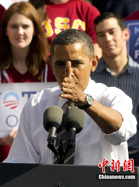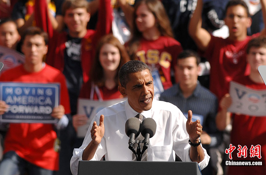 當(dāng)?shù)貢r(shí)間10月22日,距離美國(guó)中期選舉投票日還有11天,正在美國(guó)西部為民主黨助選的奧巴馬總統(tǒng)又馬不停蹄地來(lái)到洛杉磯,面對(duì)上萬(wàn)名支持者,他呼吁大家站出來(lái)為美國(guó)和加州把握正確方向。中新社發(fā) 張煒 攝