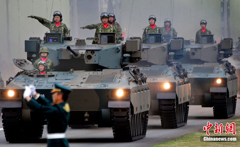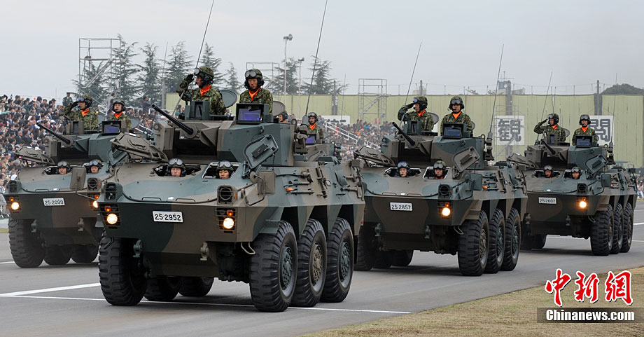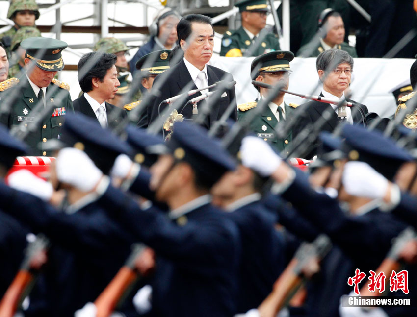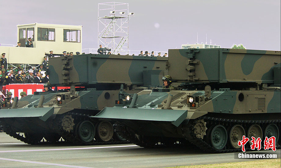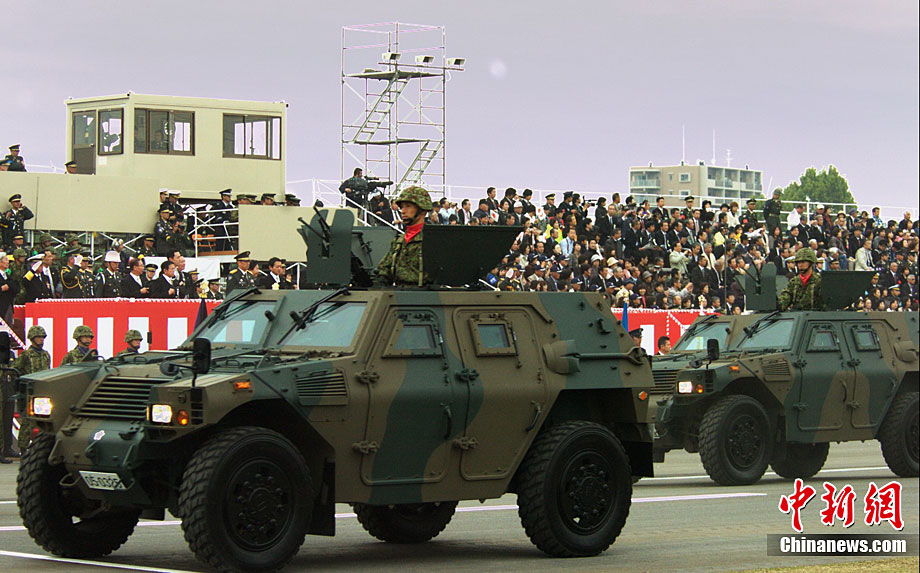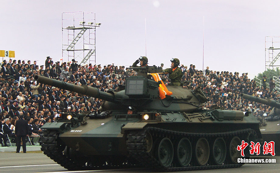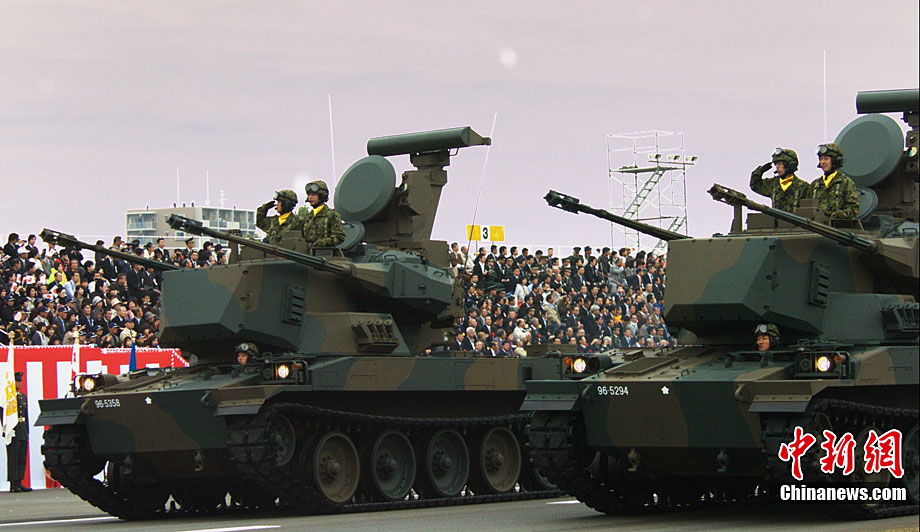 10月24日,日本自衛(wèi)隊在位于埼玉縣的朝霞訓(xùn)練場舉行了三年一度的海陸空閱兵式,首相菅直人檢閱了部隊并訓(xùn)話。參加本次閱兵式的自衛(wèi)隊員共有3800余人,分別來自海、陸、空3軍的26支部隊。閱兵式上,自衛(wèi)隊展示了各式戰(zhàn)機(jī)60余架,坦克、裝甲車等240輛。