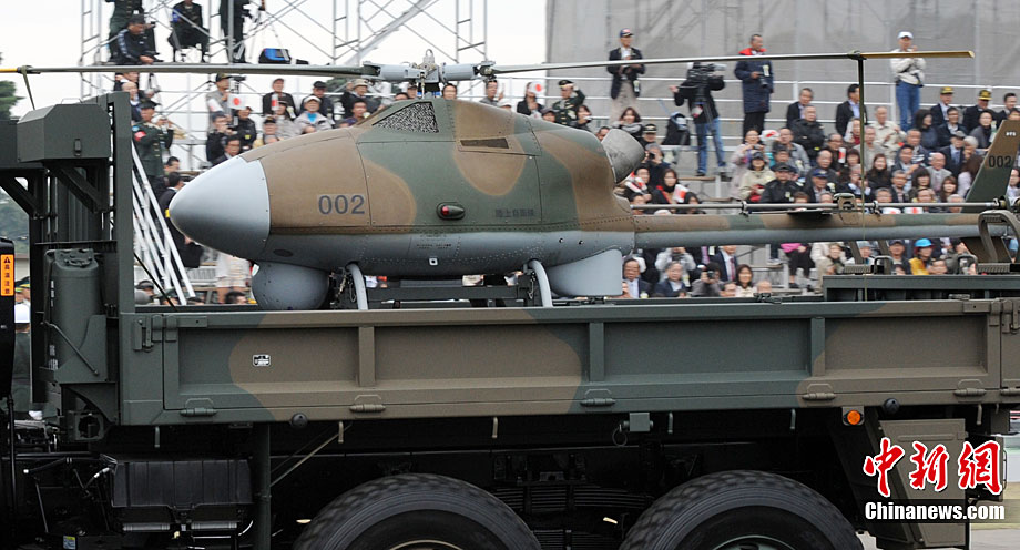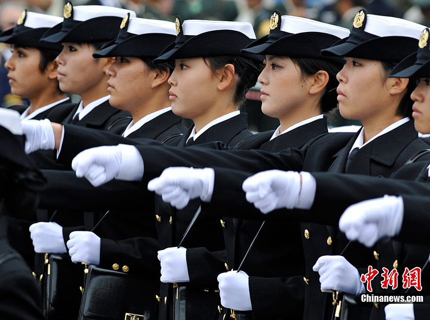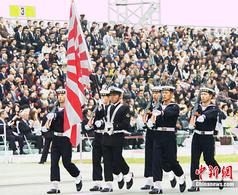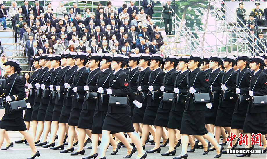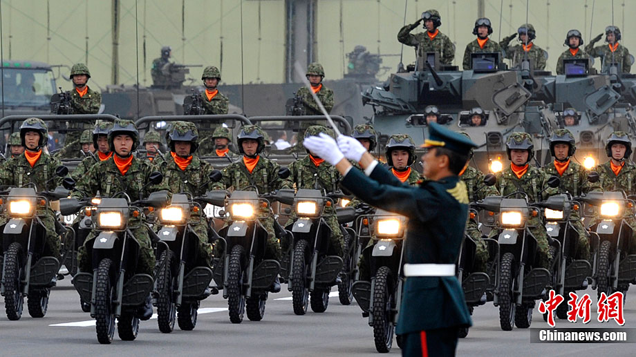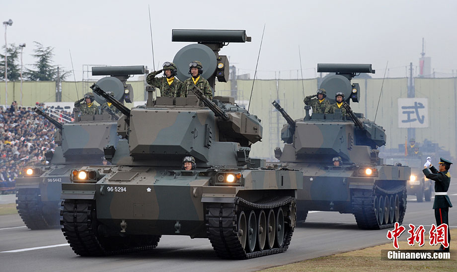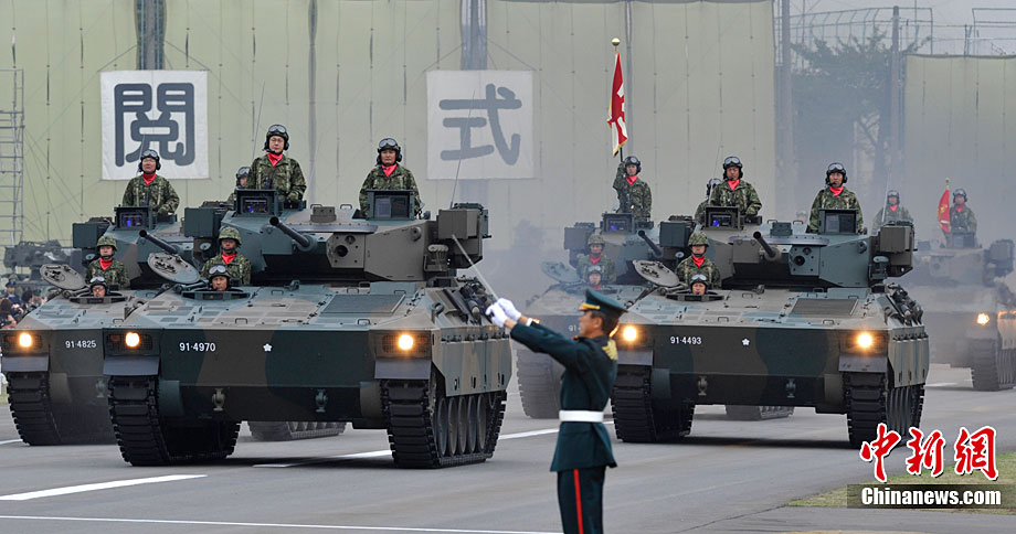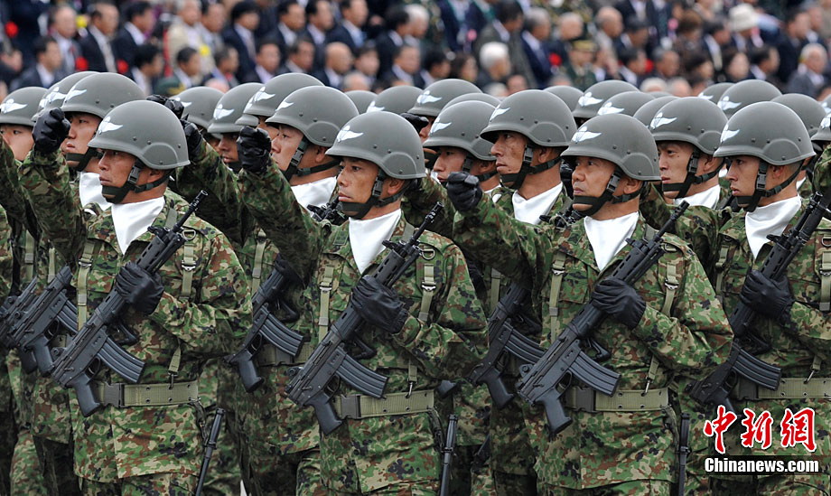 10月24日,日本自衛(wèi)隊在位于埼玉縣的朝霞訓(xùn)練場舉行了三年一度的海陸空閱兵式,首相菅直人檢閱了部隊并訓(xùn)話。參加本次閱兵式的自衛(wèi)隊員共有3800余人,分別來自海、陸、空3軍的26支部隊。閱兵式上,自衛(wèi)隊展示了各式戰(zhàn)機(jī)60余架,坦克、裝甲車等240輛。