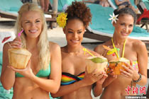 10月25日,參加正在海南三亞舉行的第60屆世界小姐總決賽的各國佳麗,在被譽(yù)為“天下第一灣”的三亞亞龍灣上演了一場(chǎng)“沙灘秀”,各國美女盡情享受三亞的陽光、海水和沙灘。中新社記者 尹海明 攝