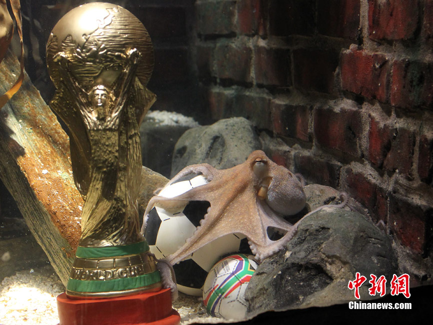 據(jù)悉,保羅的尸體目前已被冷藏,水族館正在商討“怎樣以最好的形式紀(jì)念”。圖為在世界杯后章魚(yú)保羅獲贈(zèng)一件印有它名字的西班牙隊(duì)隊(duì)服。