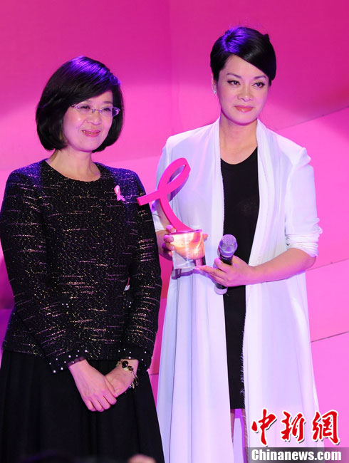 10月26日晚,《時尚健康》粉紅絲帶盛典在北京盛大舉行。歷屆粉紅絲帶代言人代表毛阿敏、柯藍與今年的代言人海清、張雨綺共同登上粉紅舞臺,江映蓉、愛戴、葉蓓、翁虹、范志博、鞏新亮、孟倩、李鑫雨等眾星云集。目前,“粉紅絲帶乳腺癌防治運動” 已成為中國最具影響力的時尚公益活動之一。圖為張雨綺、海青與眾嘉賓合影。中新社發(fā) 李學(xué)仕 攝