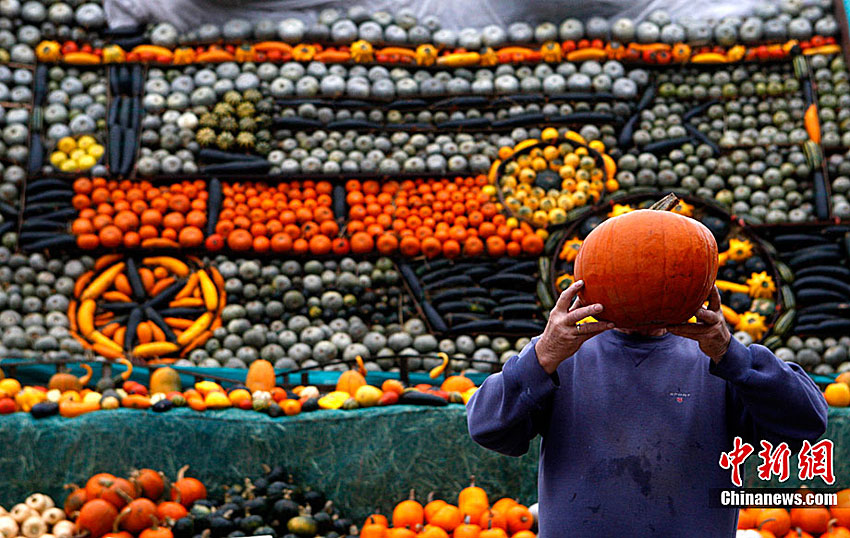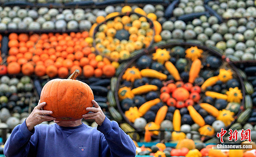 萬圣節(jié)到來的前夕,英國斯林登老農(nóng)托尼·史密斯將自己種植數(shù)百只南瓜堆成牽引機(jī)車的模型。