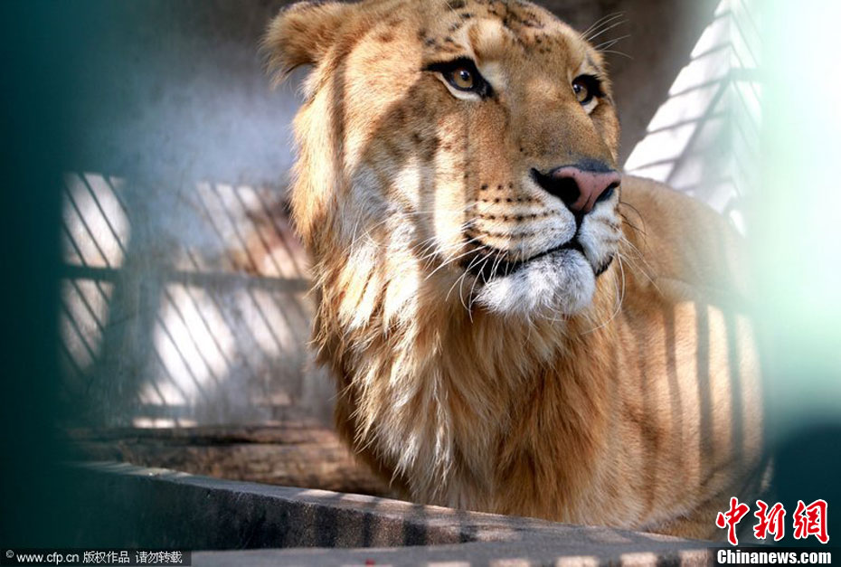 2010年10月27日,江西九江甘棠公園動物園工作人員正隔著鐵欄桿在給一只虎頭獅身的“怪物”撓癢。這只“怪物”名叫獅虎獸,是是雄性獅子和雌性老虎交配產(chǎn)生的后代。此只獅虎獸引進(jìn)自安徽安慶,目前已三歲,這是獅虎獸首次亮相江西,有關(guān)資料顯示,獅虎獸的成活率只有50萬分之一,目前世界上存活的獅虎獸只有20只左右,所以被形容為比熊貓還珍貴的動物。 圖片來源:CFP視覺中國