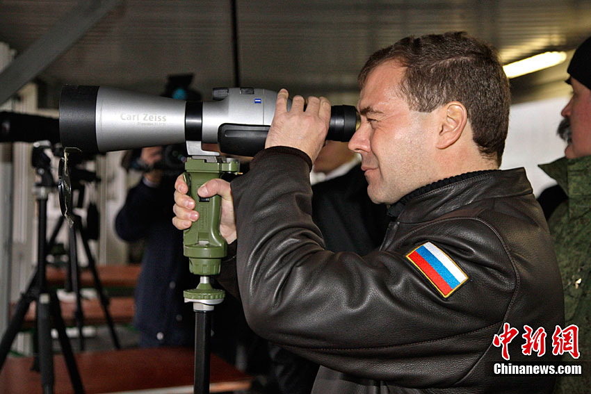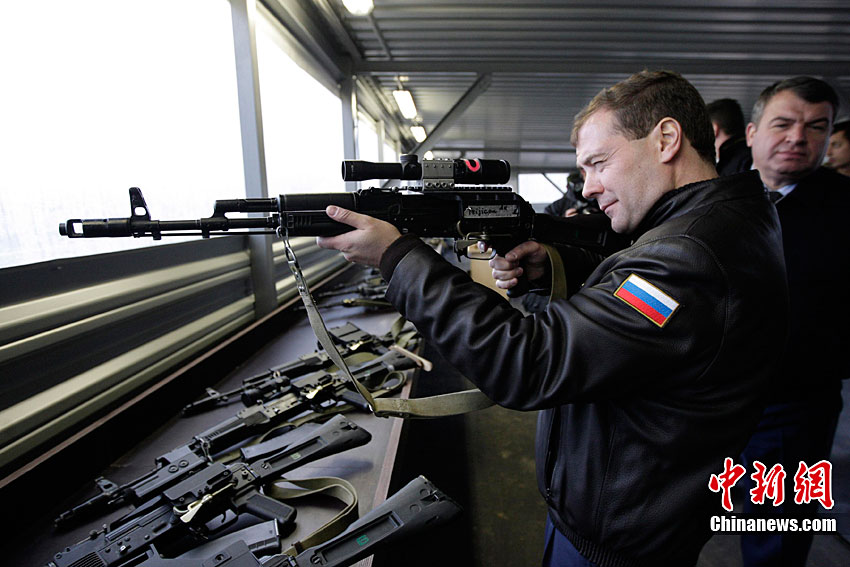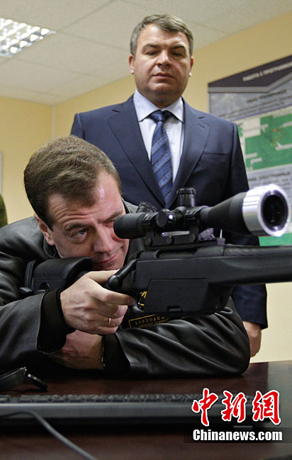 當(dāng)?shù)貢r(shí)間10月28日,俄羅斯索爾涅奇諾戈?duì)査箍,俄羅斯總統(tǒng)梅德韋杰夫在參觀國(guó)防部訓(xùn)練中心時(shí)檢查一支狙擊步槍。