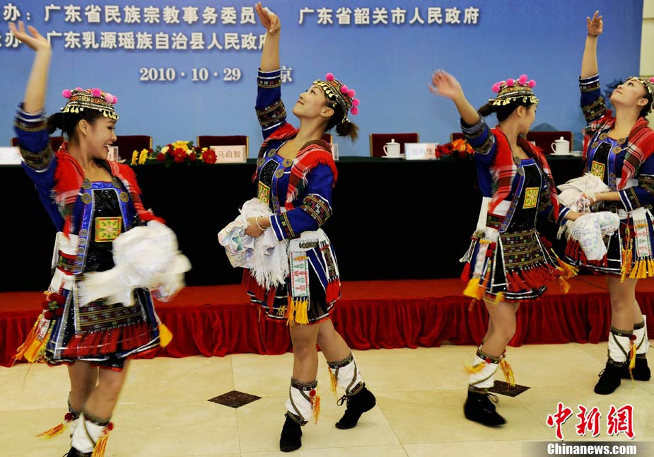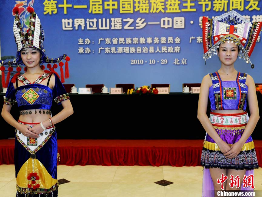 10月29日,第十一屆中國(guó)瑤族盤王節(jié)新聞發(fā)布會(huì)暨世界過(guò)山瑤之鄉(xiāng)——中國(guó)乳源旅游推介會(huì)在人民大會(huì)堂召開。本次會(huì)議發(fā)布,世界瑤族人民的盛會(huì)——第十一屆中國(guó)瑤族盤王節(jié)將于2010年11月20日至22日在廣東乳源瑤族自治縣隆重舉行,幾灞P王節(jié)是瑤族人民紀(jì)念其始祖盤王(盤瓠)的盛大節(jié)日。圖為“瑤族公主”形象代表身著湘粵桂南嶺地區(qū)的瑤族盛裝亮相新聞發(fā)布會(huì)。中新社記者 劉震 攝