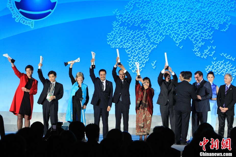 10月30日晚,上海世博會舉行頒獎晚會,頒發(fā)“世博會獎”、“COSMOS”獎、“國展局獎章”!笆啦⿻劇狈譃锳BCD四類展館和金銀銅等次以及展館設計獎、創(chuàng)意展示獎、主題演繹獎。圖為英國、韓國、西班牙分別獲得A類展館設計獎金銀銅;沙特、日本、馬來西亞分別獲得創(chuàng)意展示獎金銀銅;德國、俄羅斯、法國分別獲得主題演繹獎金銀銅。 中新社記者 潘索菲 攝