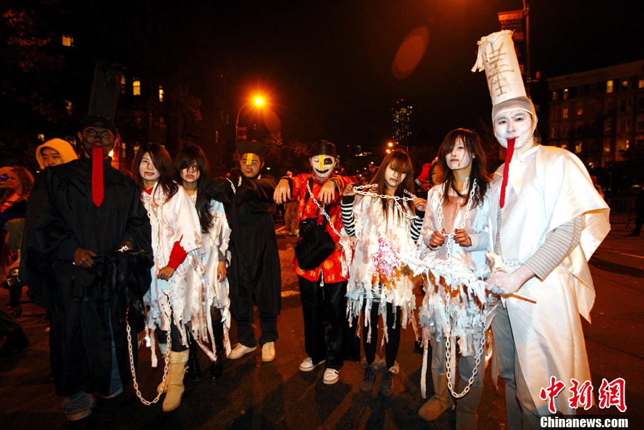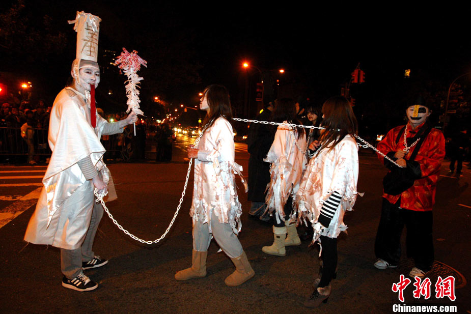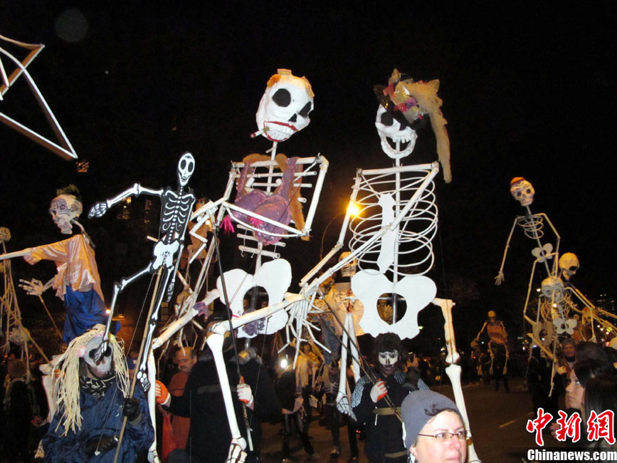 當(dāng)?shù)貢r(shí)間10月31日晚,一年一度的紐約萬圣節(jié)前夜狂歡大游行在紐約第六大道舉行,這是全世界最大的萬圣節(jié)游行。中新社記者 孫宇挺 攝