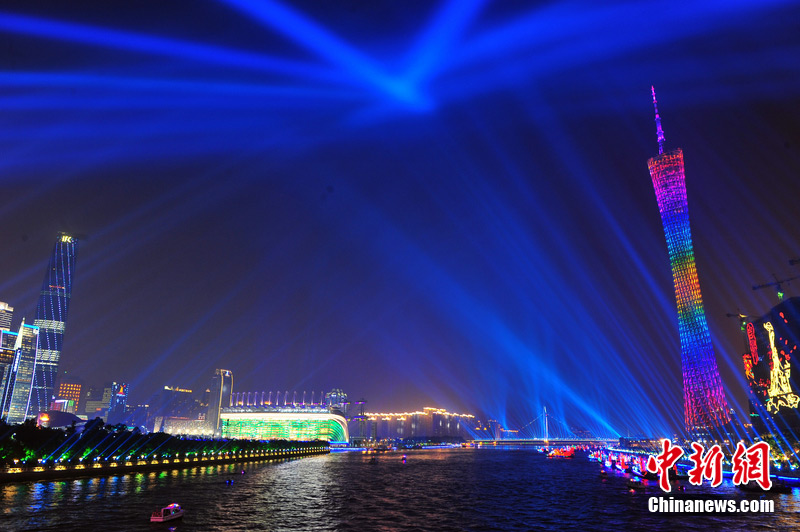 2010年11月3日晚,廣州海心沙上演包括煙花預(yù)演在內(nèi)的亞運(yùn)開幕式帶妝彩排。圖片來源:CFP視覺中國