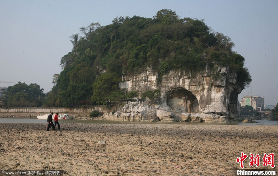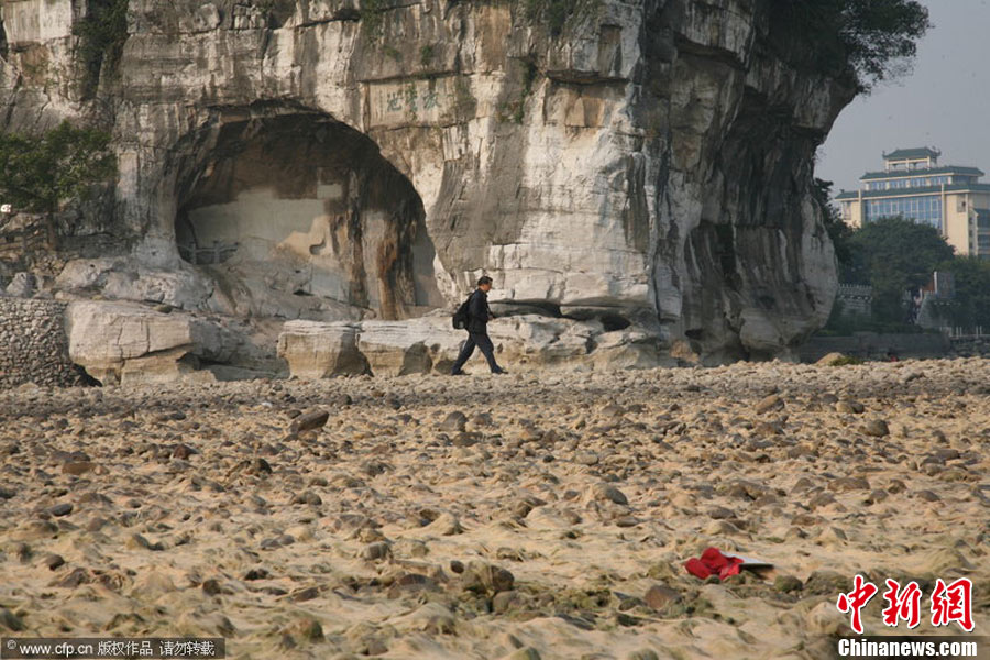2010年11月4日,廣西桂林,象鼻山前干涸的河床。入秋以來,桂林持續(xù)干旱,漓江水位下降,進入秋冬枯水期。李凱 攝 圖片來源:CFP視覺中國